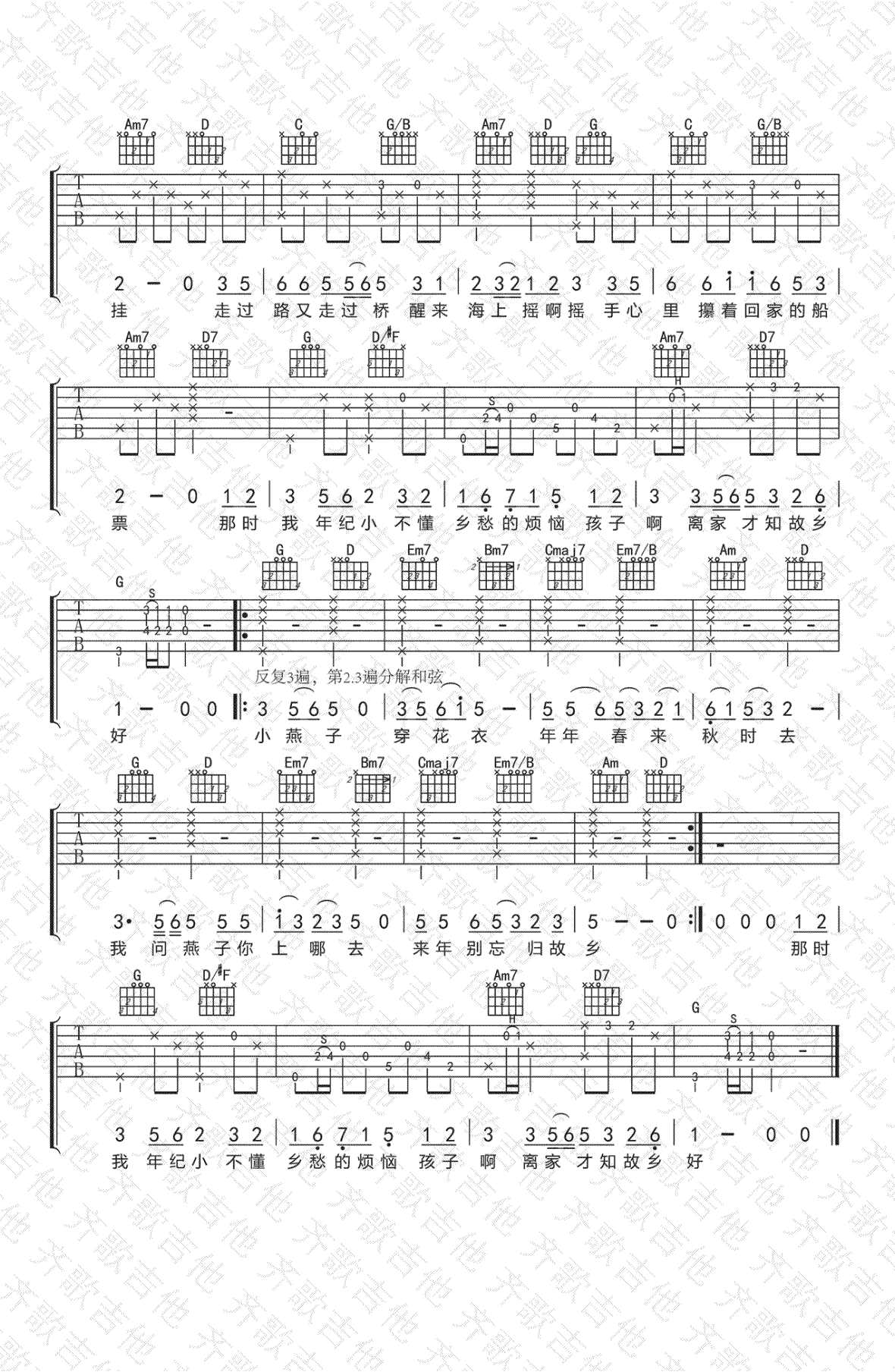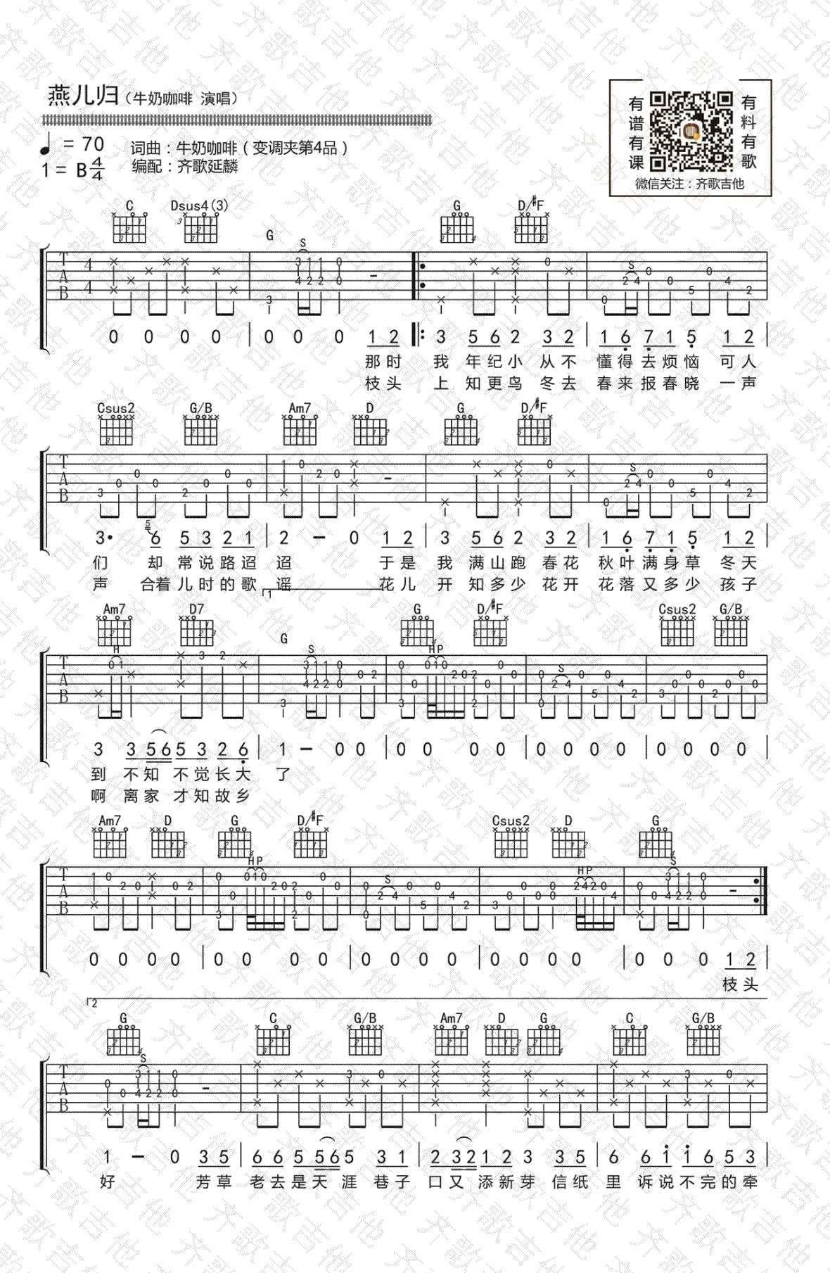 曲谱介绍:   燕儿归吉他谱,牛奶咖啡演唱的新歌单曲,充满浓浓乡情的暖心歌曲,陪伴你归乡的路途。燕儿归六线谱,原调B,选用C调指法,变调夹夹四品,感谢齐歌延麟老师编配。   歌曲用五声音阶来写成,非常旋律化,也具有民族特色。节奏多以八分音符来排列,就像讲故事、说心事一些娓娓道来。编配的时候,没有把每一次重复演唱时吉他的一些变化全记录下来,如果你是新手,照谱子弹每遍弹得一样即可,如果是有一定基础的,可以适当再加入一些变化,但不宜过多。