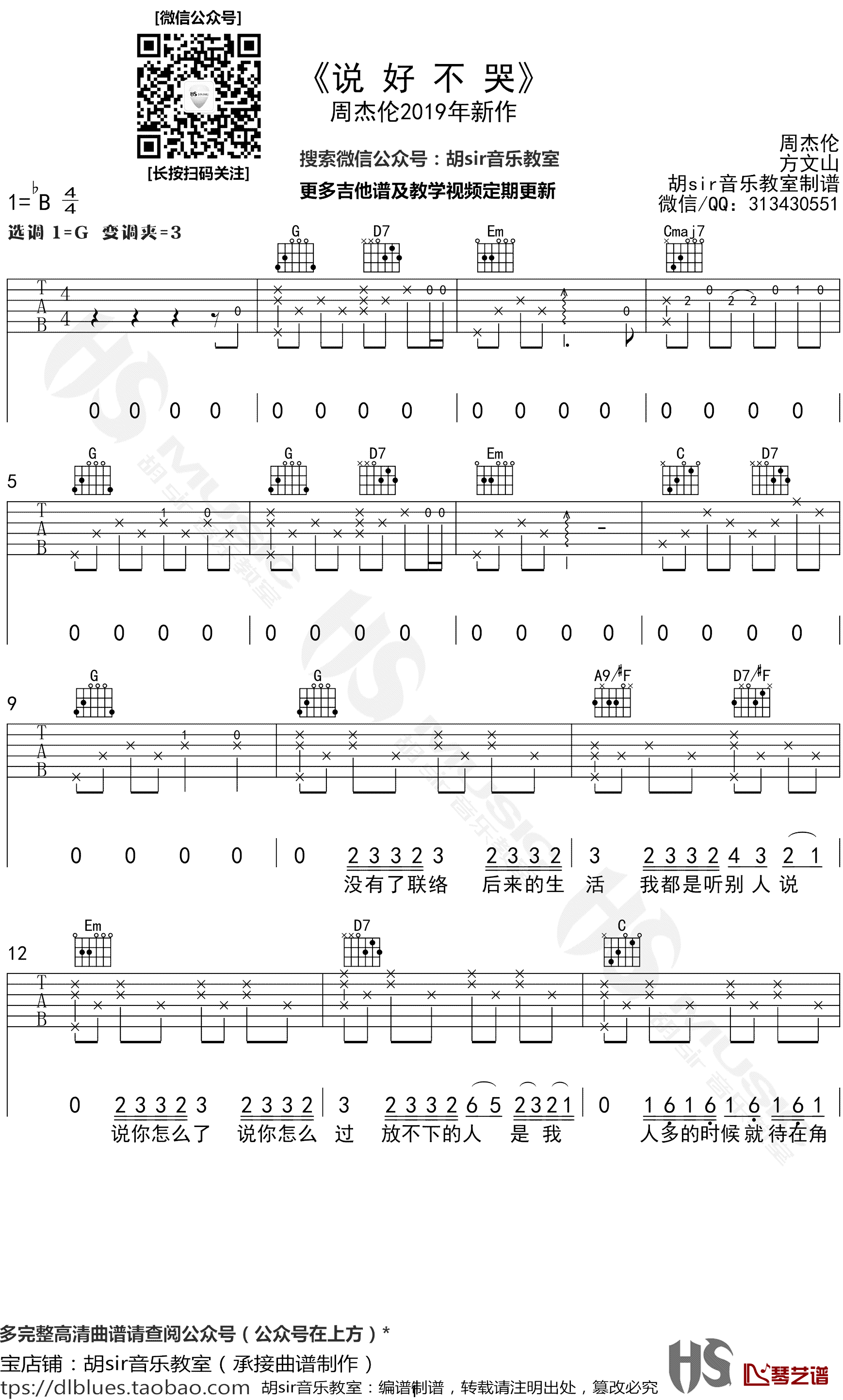 曲谱介绍:   说好不哭吉他谱首发,本月16日晚上周杰伦11点发布的新歌,是不是很新鲜呢,时隔好多年周杰伦又出新歌曲了,一定等坏了很多的歌迷和粉丝这首歌曲周杰伦作曲方文山作词。   经典的搭配组合,多少经典之作他们二人合力完成,我们一起听听这首新歌,说好不哭吉他谱很简单采用G调编配,琴友们可以把变调夹夹3品就是原调如果觉得高也可以不用夹子,说好不哭弹唱六线谱,感谢 胡sir音乐教室制作,琴谱网整理上传,来我们一起来练习吧加油。
