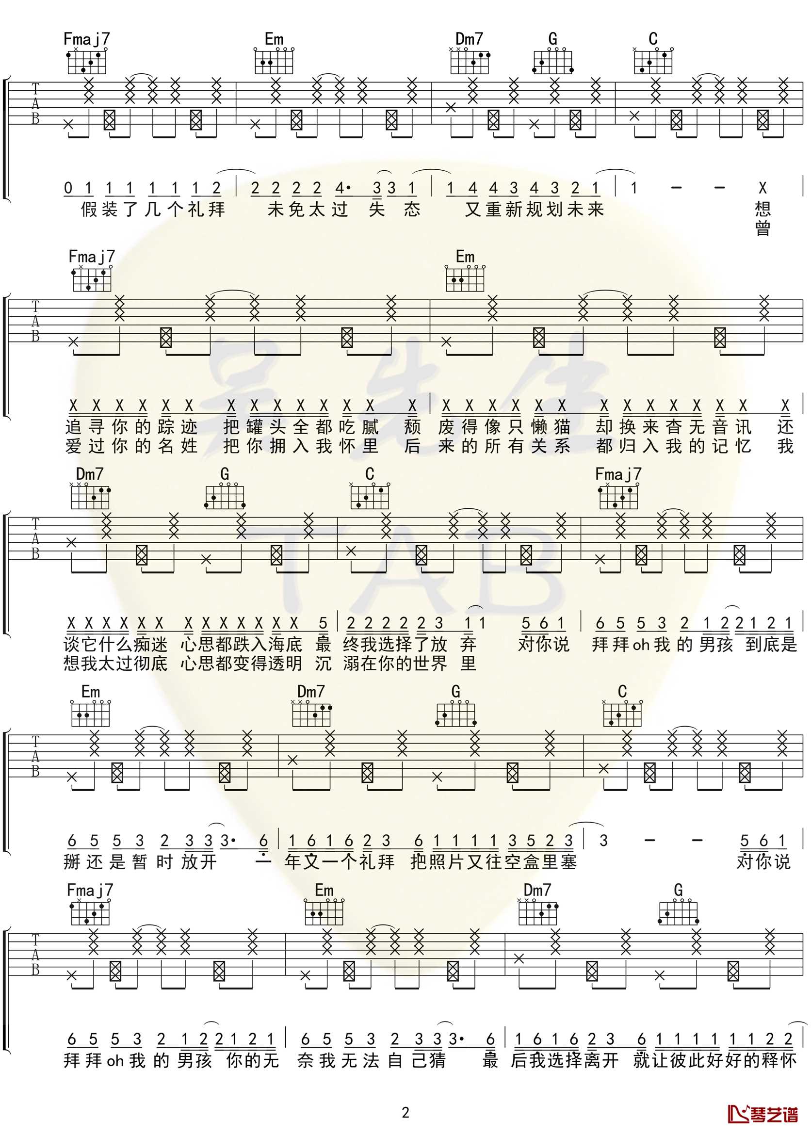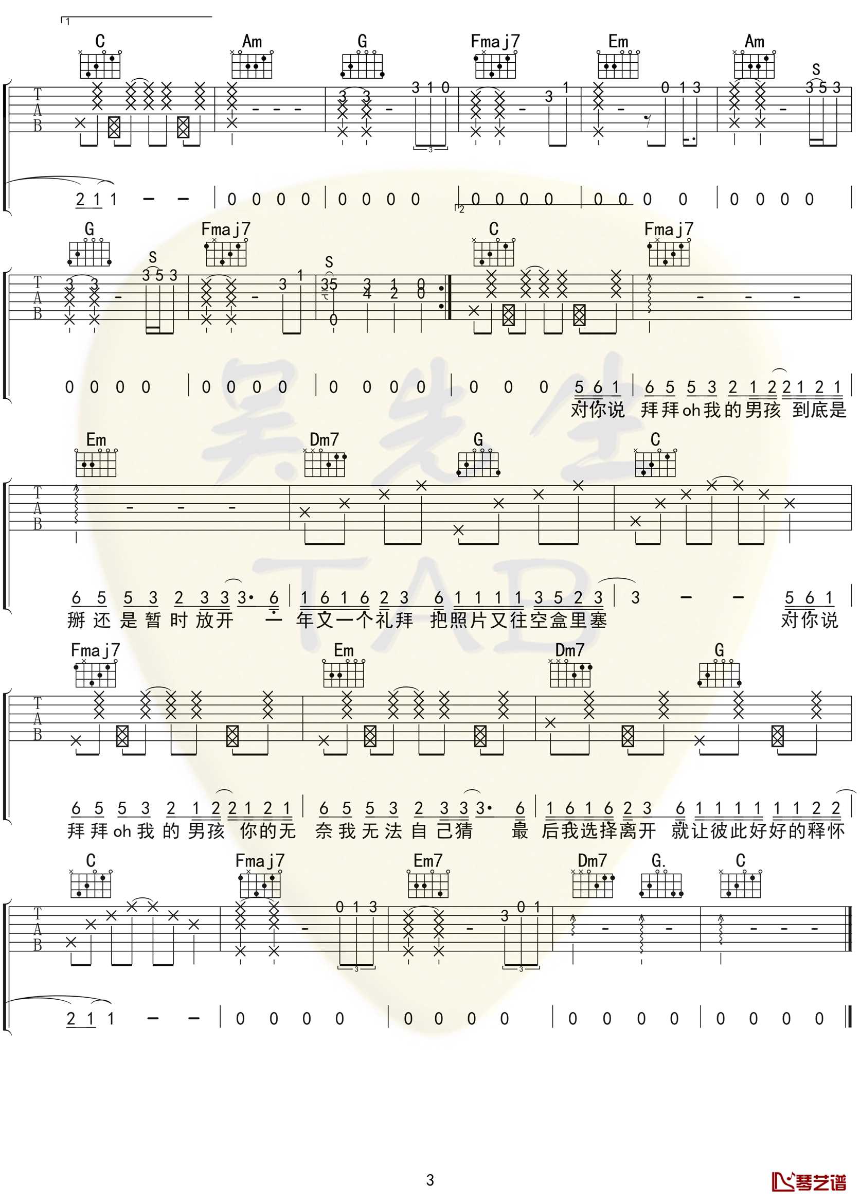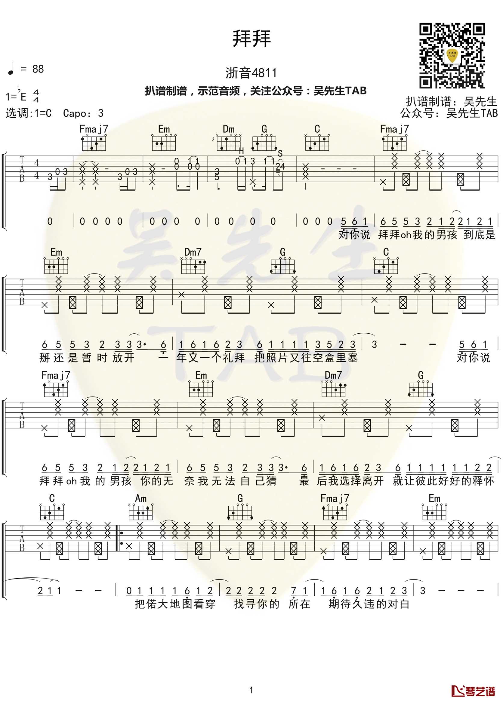 曲谱介绍:   浙音4811《拜拜》吉他谱,歌曲原调降E调,编配的时候选用C调指法编配,弹奏时候变调夹夹3品,拜拜弹唱六线谱,吉他谱由吴先生TAB制作上传,并附上弹奏的示范音频,浙音4811是四个来自浙江音乐学院女生宿舍4811的小姐姐。因在抖音平台上翻唱林俊呈的《东西》而爆红,她们的歌声不仅俏皮可爱和声配合得也比较惊艳(别人家的舍友系列)。   《拜拜》这首歌也延续了她们俏皮可爱的风格,轻快的曲调让人想不到这首歌居然是分手后怀念前男友的歌,想到曾经的男孩或许心里是很悲伤的,但是用这样轻快的曲调却显得颇为洒脱。