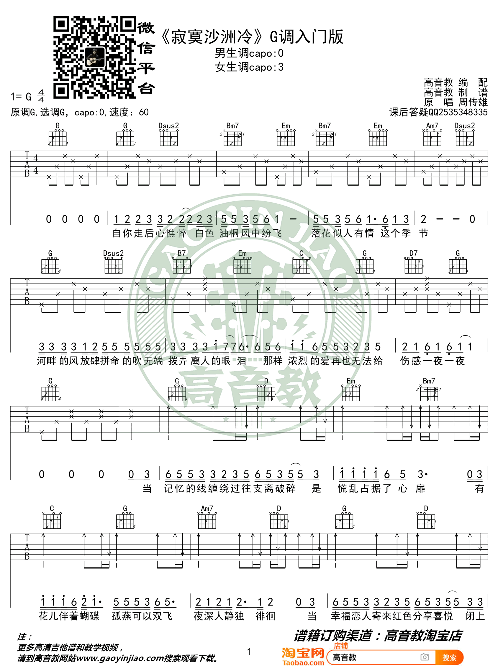 曲谱介绍: 《寂寞沙洲冷》吉他谱,周传雄的一首经典代表歌曲,寂寞沙洲冷六线谱,G调入门版,两张弹唱图片谱,高音教编配出品,吉他谱整理分享。 歌曲的创作灵感来自苏轼的《卜算子》,唱出恋人分飞后的伤感孤寂。拣尽寒枝不肯安歇,微带着后悔,寂寞沙洲,我该思念谁?北宋大文豪苏轼当年在黄州写下这首诗词后,断然不会想到,900多年后的今天,这首用他的句子“寂寞沙洲冷”为歌名的流行歌曲,会火遍大江南北。