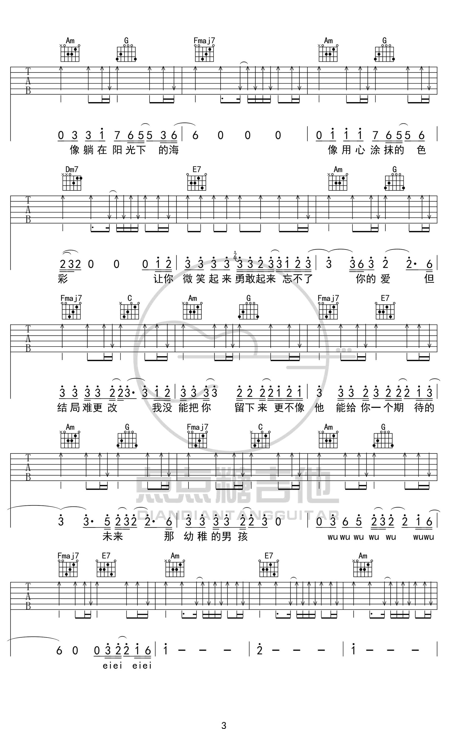 曲谱介绍: 《男孩》吉他谱,梁博在《我是歌手》上所演唱的版本男孩六线谱,原调#C调,C调指法编配,变调夹夹在吉他的1品位置。感谢点点糖吉他编配,琴谱网网上传更新。 老师编配提示 :前奏、尾奏、副歌的和声走向是6-5-4-1-6-5-4-3,主歌稍微变了一点,都是往后递减的走向,大家在演奏的时候好好把握。难点在前奏和尾奏(前奏和尾奏都是一样的),十六分附点的节奏可能会有点不好弹,建议结合梁博所演唱的版本来演奏;主、副歌都是扫弦的节奏型,难度不大,根据情绪的变化控制力度就行了。