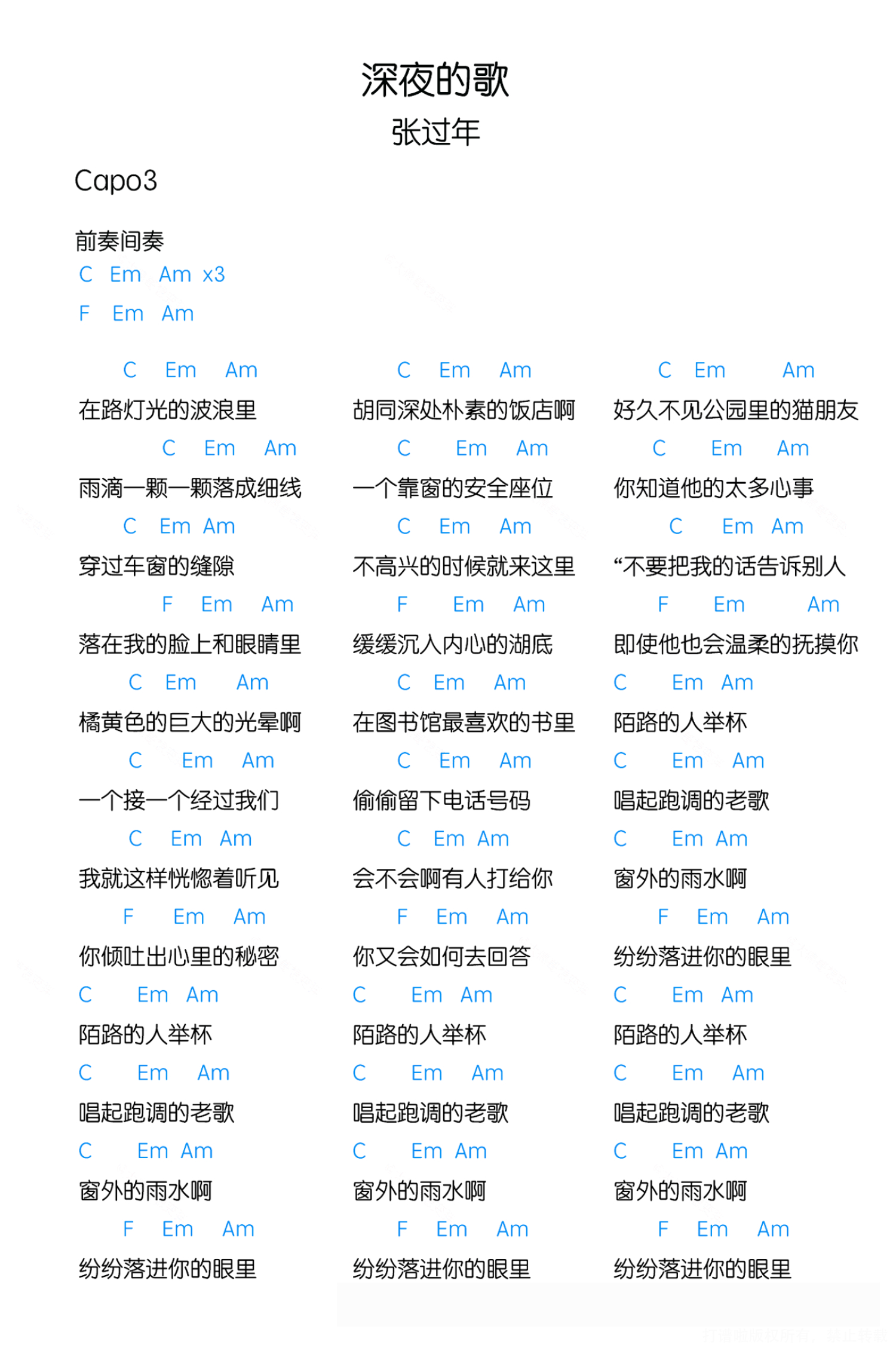 曲谱介绍: 张过年《深夜的歌》尤克里里谱,CAPO夹三品,