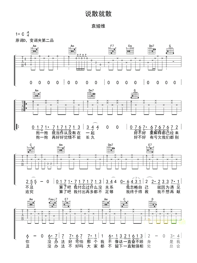 曲谱介绍:   《说散就散》是陈泳彤原唱的歌曲,亦是电视剧《入侵者》的片头曲,由张楚翘作词,伍乐城作曲,发行于2016年6月14日。2017年12月,该曲成为电影《前任3:再见前任》的主题曲,先后发行了由袁娅维翻唱的版本,以及艾福杰尼、黄旭和田羽生演唱的改编版本。   陈泳彤在录制该曲的时候,正好处于失恋阶段。歌词中的“说不上爱别说谎,就一点喜欢”,很贴合她当时的心境,因此令她感同身受,并在录音室里把她自己唱哭了。