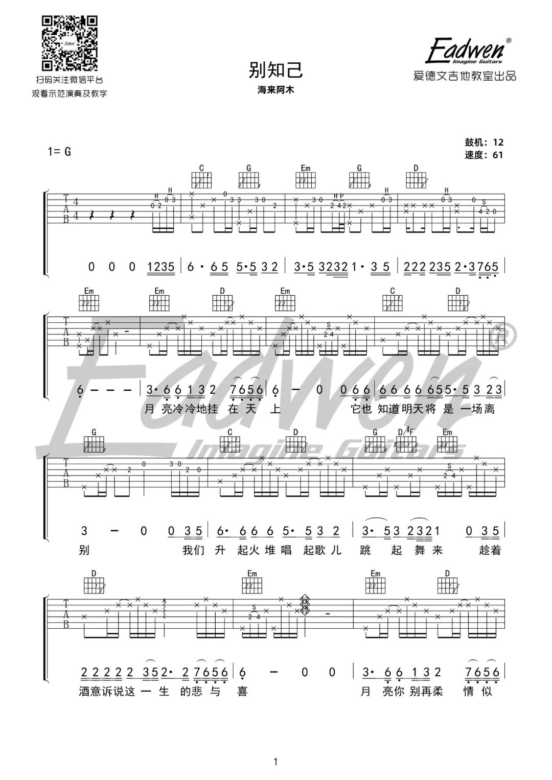 曲谱介绍: 吉他谱介绍:别知己吉他谱,海来阿木演唱的一首歌曲,4/4拍的节奏,这首歌曲的原调为G调,这里曲谱采用了G调指法进行编配,演唱时可不夹变调夹,曲谱由琴谱网更新上传,共5张高清图片弹唱吉他谱例,来源于@爱德文吉他教室编配出品。一首直击心灵的歌曲,写满离别相思之情。我的朋友你别再多愁善感,昨天已经过去,所有的伤心和烦恼已离去,你要相信明天的天空,会更蔚蓝! 别知己吉他弹唱教学