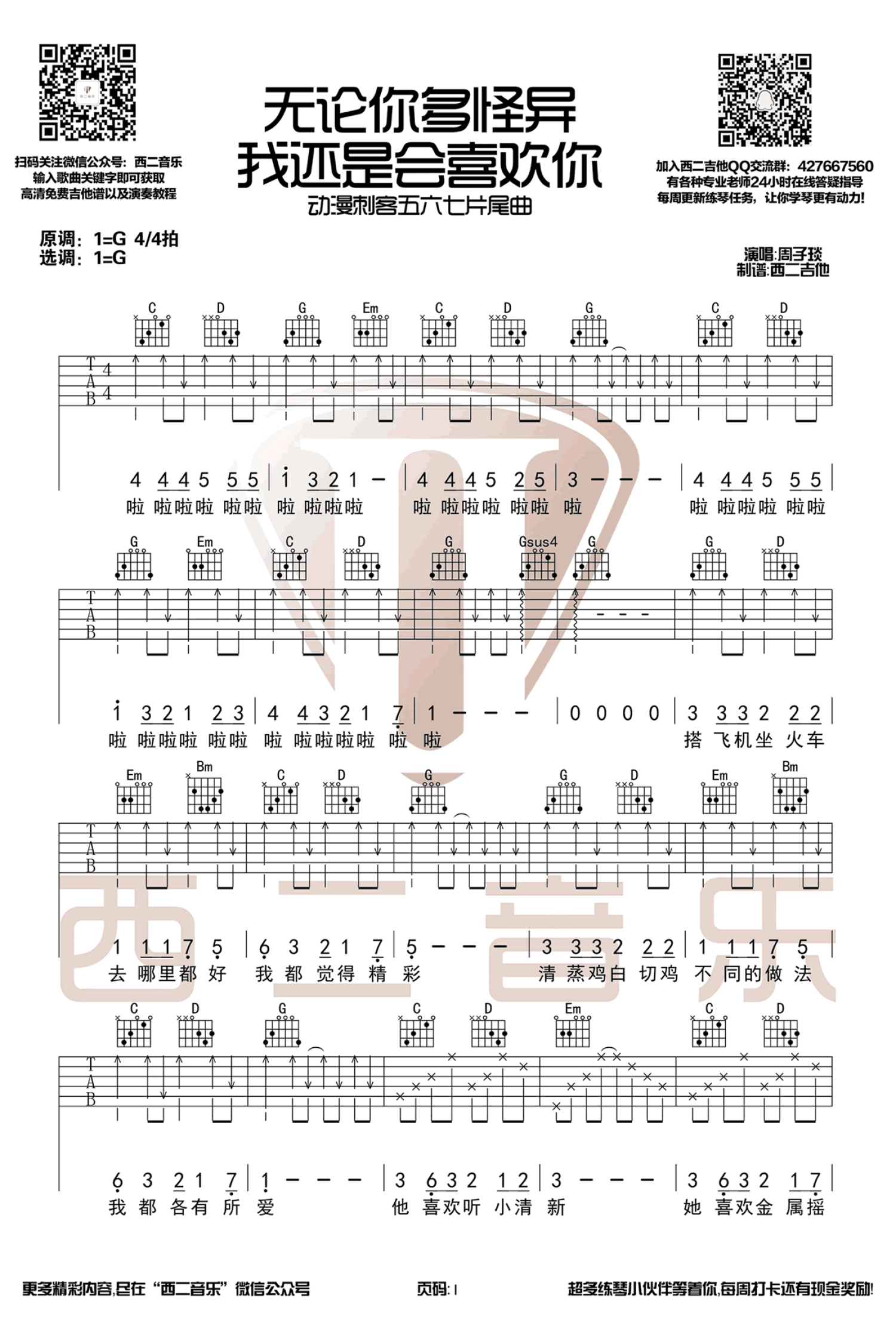 曲谱介绍: 无论你多么怪异我还是会喜欢你吉他谱,周子琰/江惠莲演唱,动画片《刺客五六七》片尾曲,无论你多么怪异我还是会喜欢你六线谱,这部动漫颇受大家的喜爱,连同这首片尾曲也连带深受大家的喜爱,歌曲很有特点,又清新,歌名更是令人青睐,我想无论你是多么怪异的人身边一定有喜欢你的人。