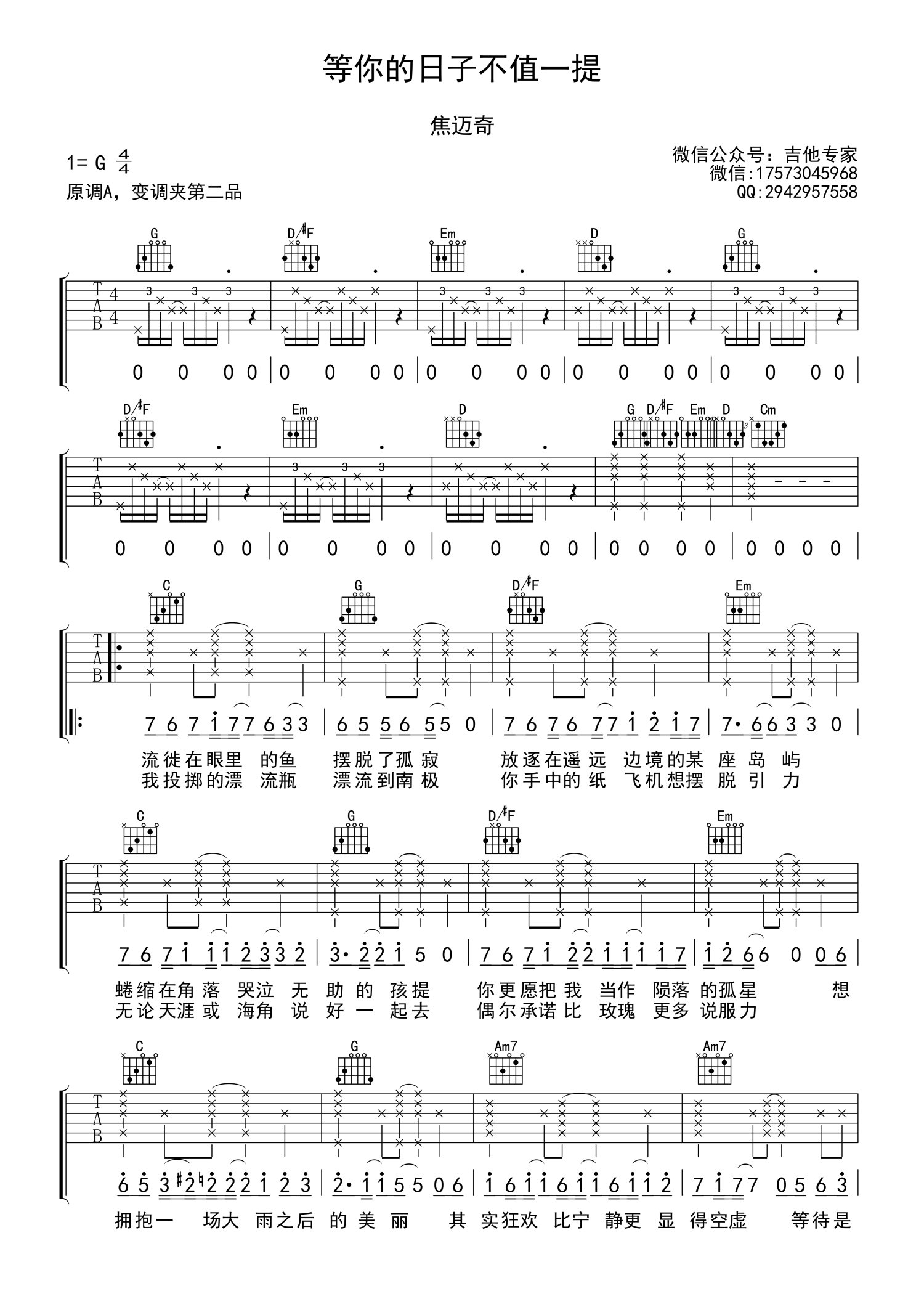 • 等你的日子不值一提吉他谱 - 焦迈奇 - G调吉他弹唱谱第1张