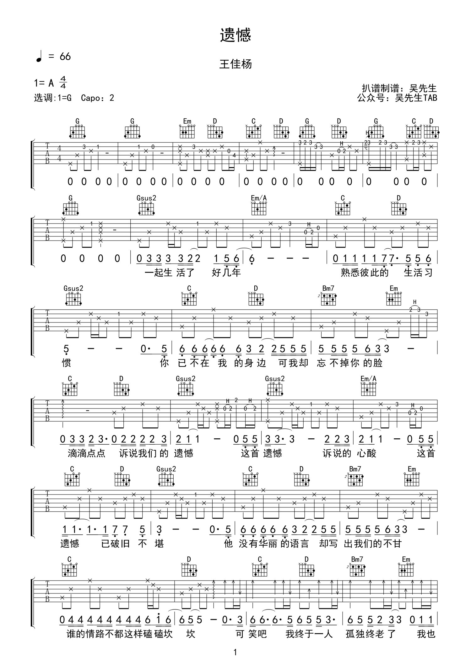 • 遗憾吉他谱 - 王佳杨 - G调吉他弹唱谱第1张