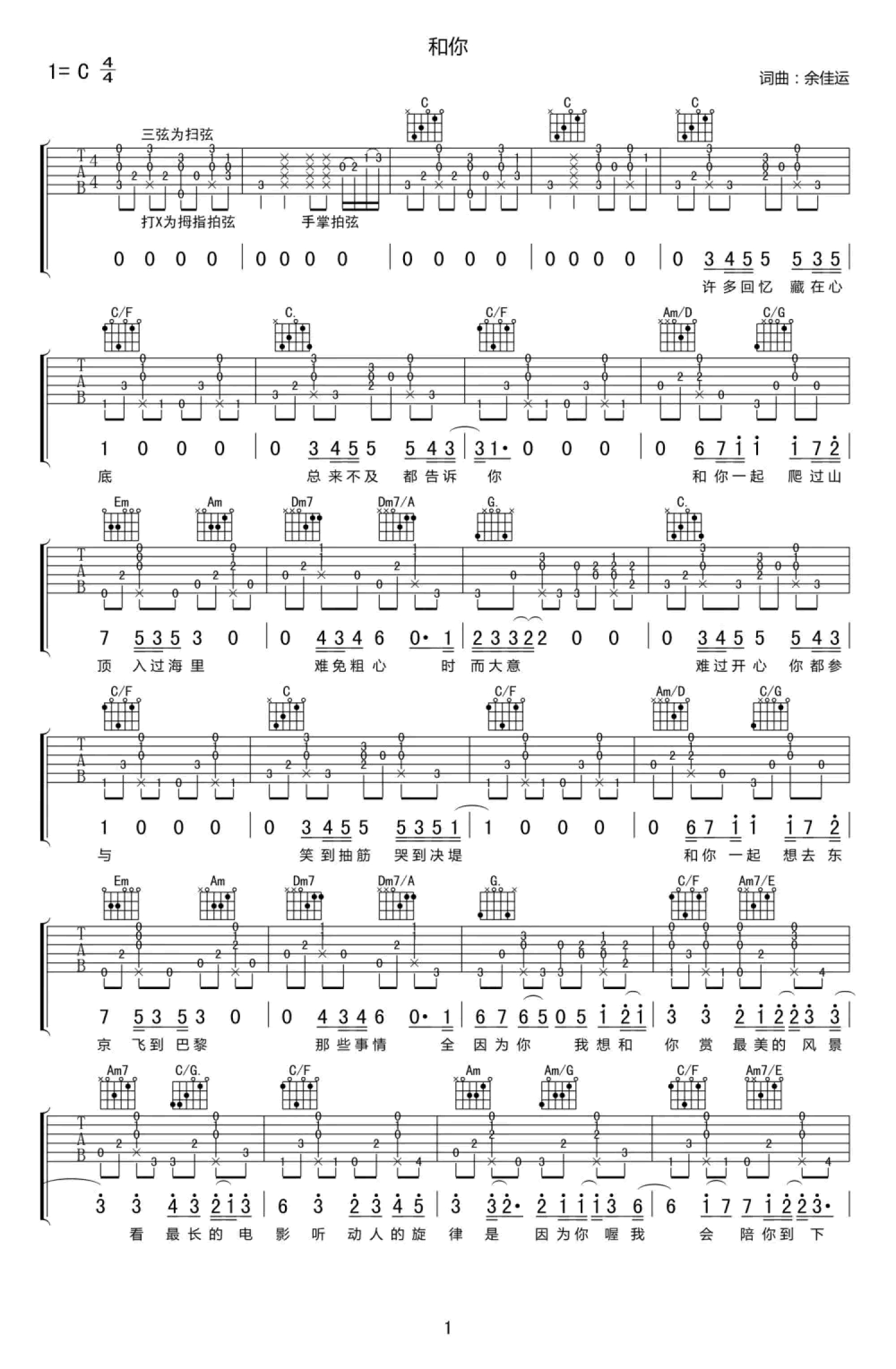 和你吉他谱 - 余佳运 - C调吉他弹唱谱