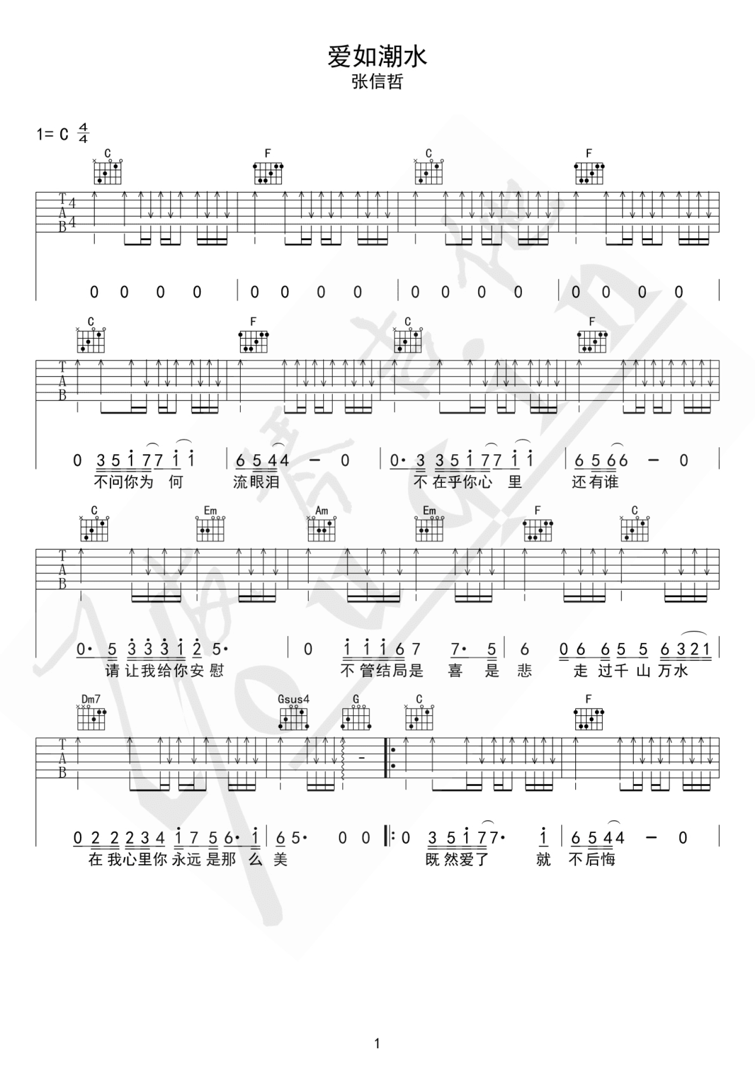 曲谱介绍: 张信哲《爱如潮水》吉他谱_C调吉他弹唱谱