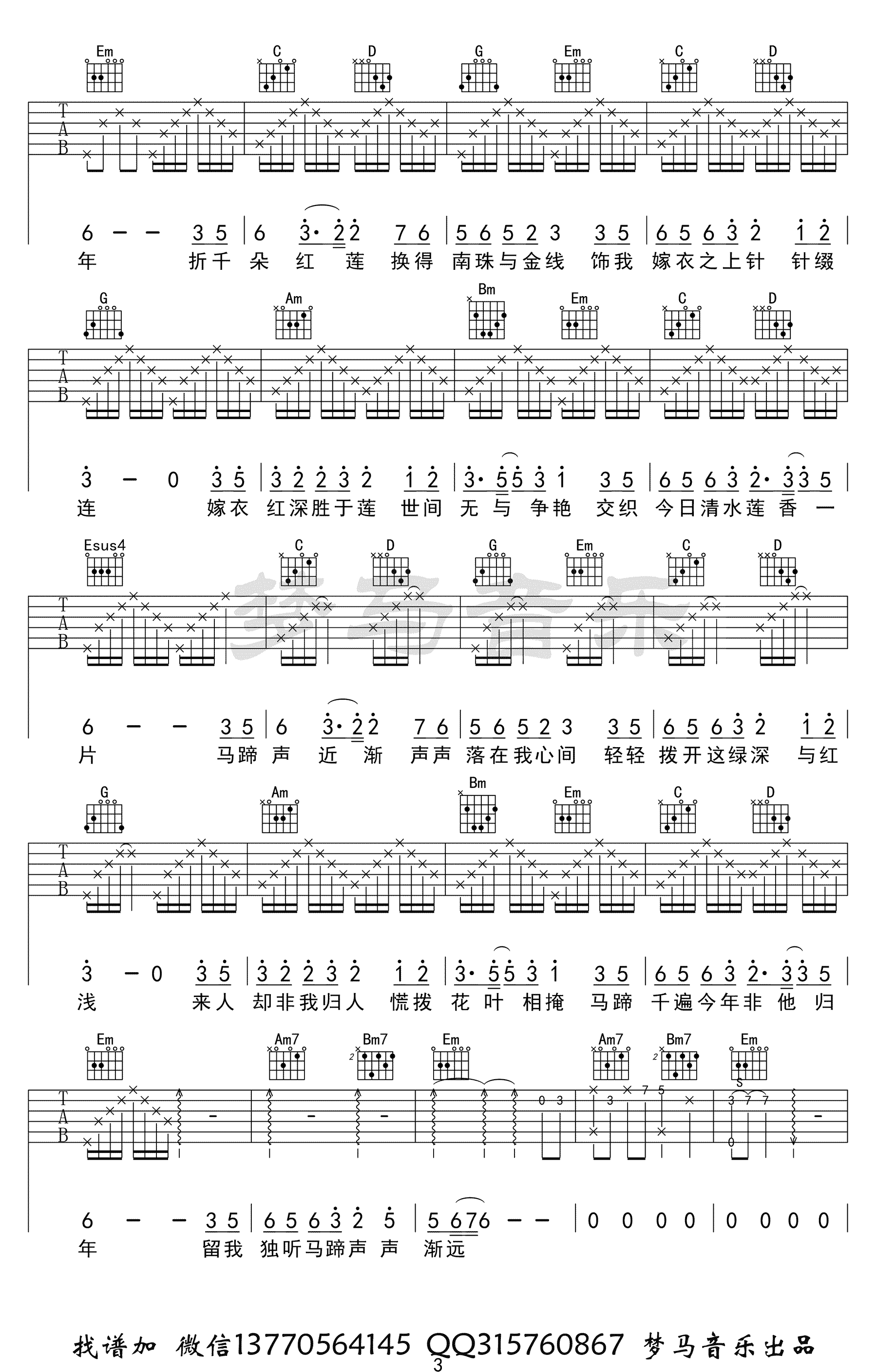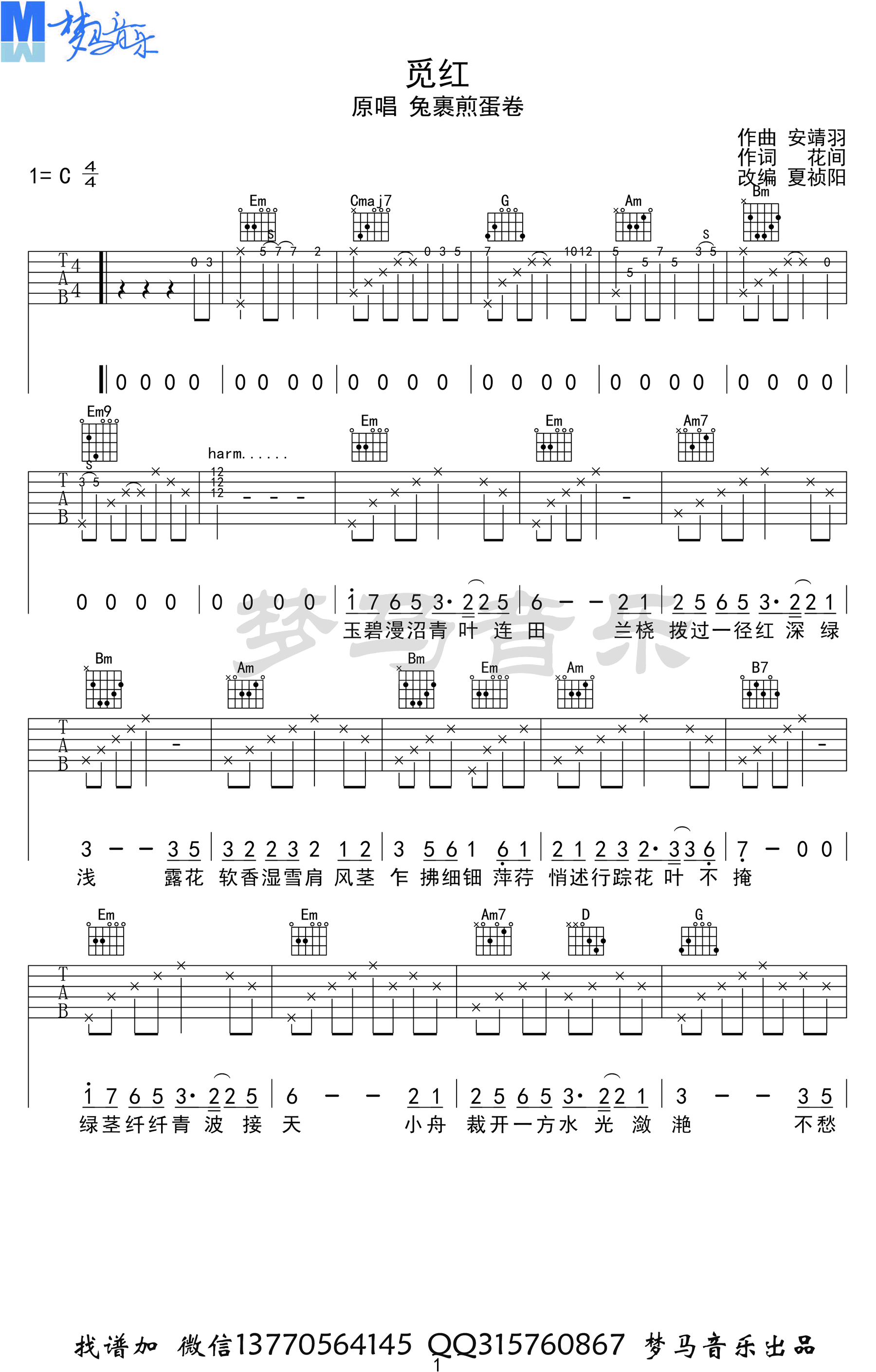 曲谱介绍: 《觅红》吉他谱,兔裹煎蛋卷演唱的一首小众古风歌曲,觅红六线谱,C调指法,完整版共四张高清图片谱。随谱附上曲谱配套吉他弹唱演示视频,梦马音乐出品,琴谱网网更新分享。 夏祯阳老师编配说明:对于这首歌曲的改编,这次我没有用扫弦,全部用的分解和弦。有人听过了音乐跟我说这首歌我没有用扫弦,感觉反而更好。副歌部分用的都是快节奏的十六分音符来突出歌曲的高潮。弹起来的时候手速要够快哦!