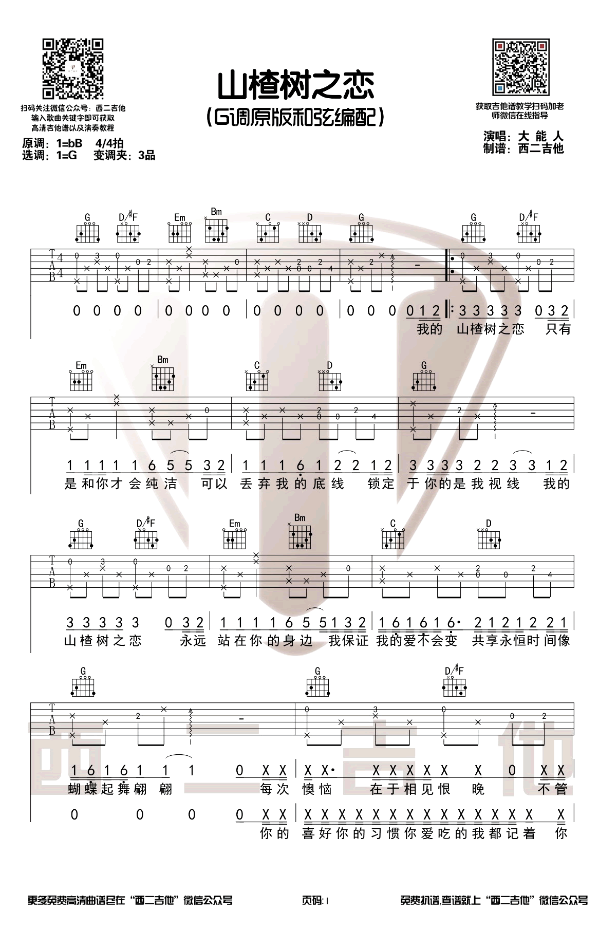 曲谱介绍: 《山楂树之恋》吉他谱,大能人演唱,抖音很火的一首歌曲,山楂树之恋六线谱,原调bB,选用G调指法原版编配,变调夹夹第三品。西二吉他制谱出品,琴谱网网更新上传。 小编刚听到这歌名的时候,还以为这首歌是电视剧《山楂树之恋》的主题曲呢,听完一遍之后才发现这首歌的原唱是大能人,和电视剧没有关系。这首歌在抖音上被程佳佳翻唱之后突然爆火,整首歌由副歌一段旋律撑起来,中间穿插着主歌和一段说唱,歌词打动人心旋律也很优美,大家一起吉他弹唱练习起来。