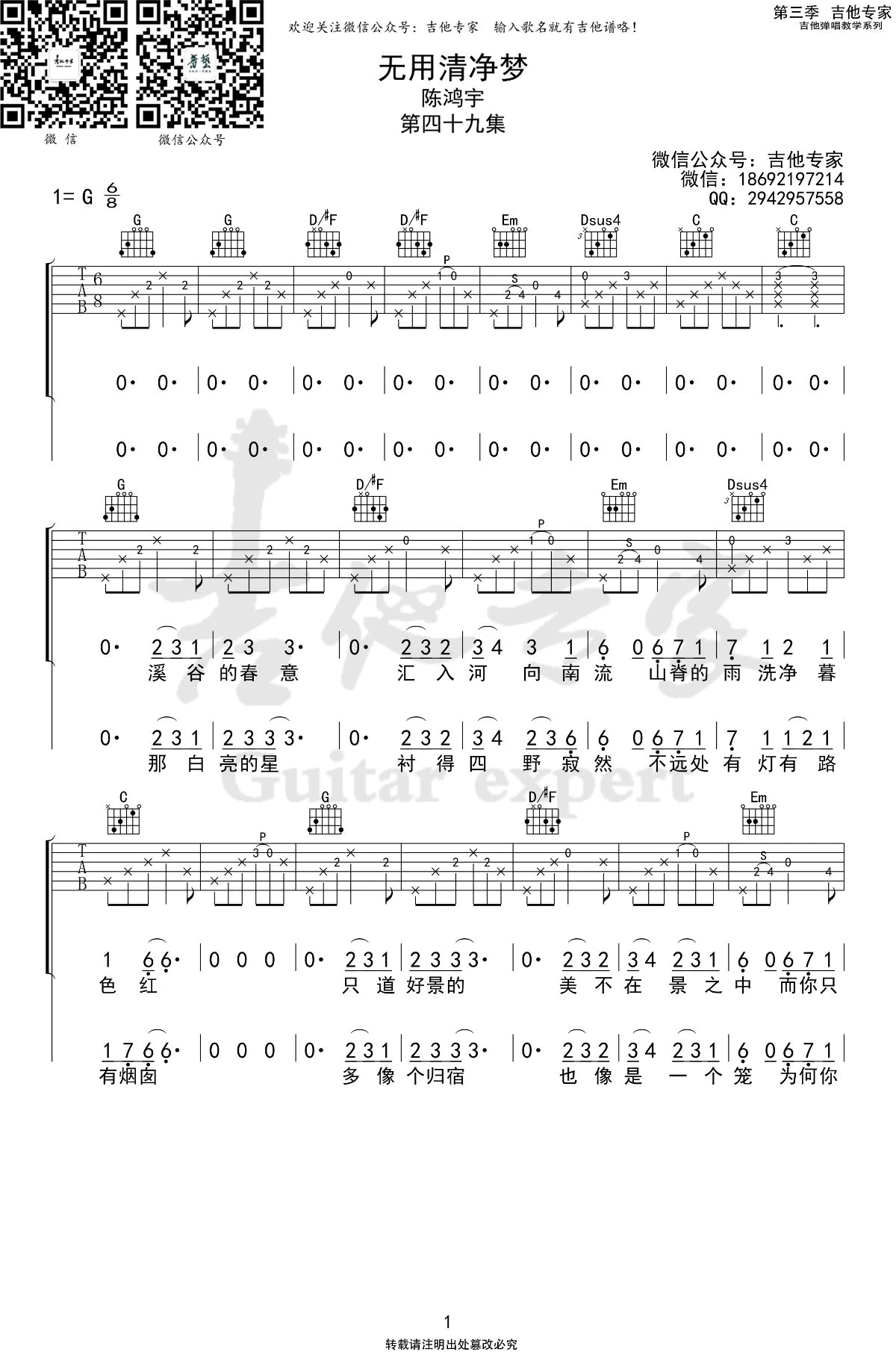 曲谱介绍: 无用清净梦吉他谱,陈鸿宇的一首原创民谣歌曲,无用清净梦六线谱,G调和弦指法,三张弹唱图片谱。 人间的满也是这人间的空,你可想过你为何匆匆?祝各位每天步履不停,奔赴着灿烂前程;黄昏伴着火烧云回家;夜里无牵挂,做个无用清净梦。