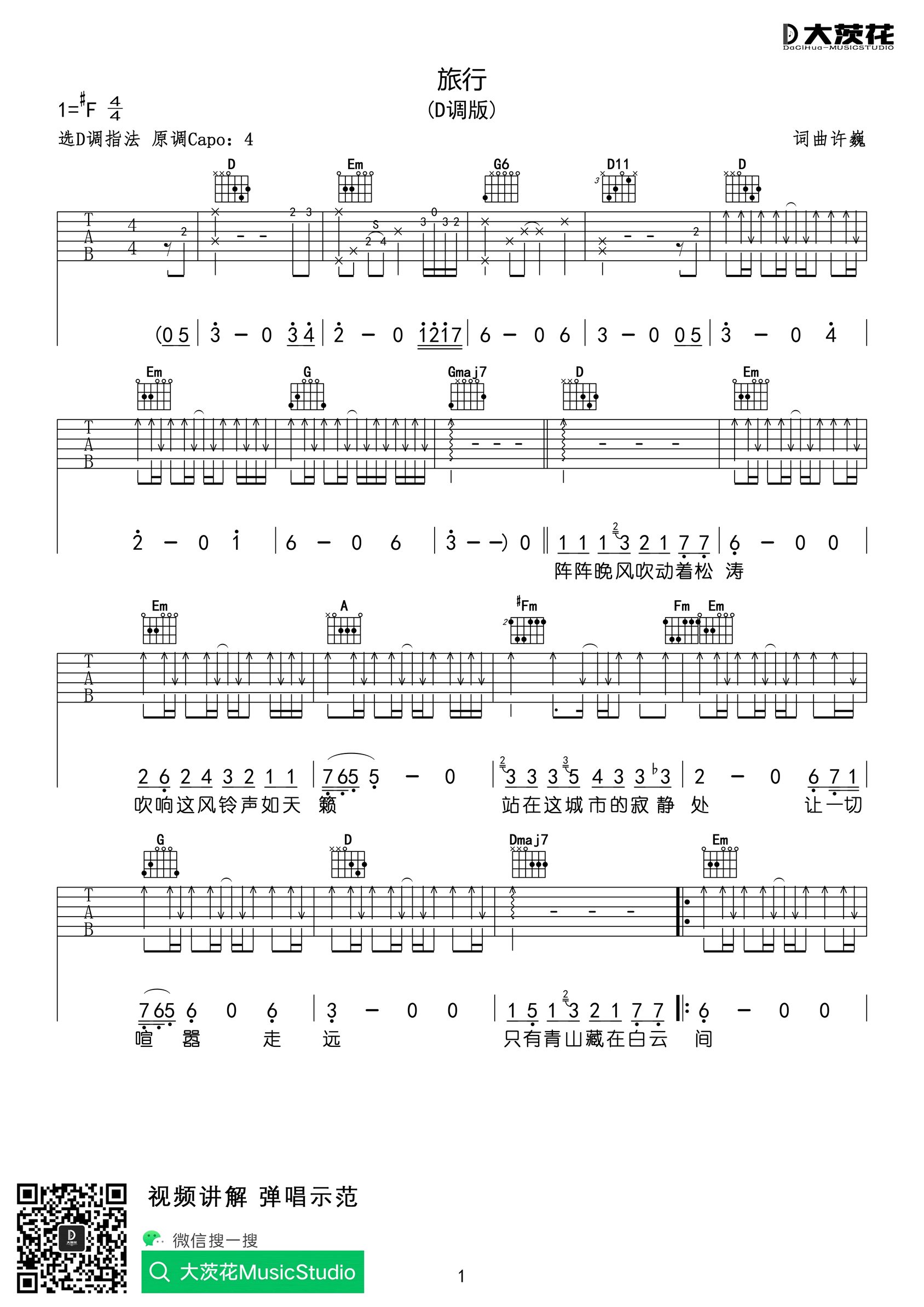 曲谱介绍: 旅行吉他谱,许巍的一首经典代表歌曲,旅行吉他六线谱,原调升F,选用D调指法编配,变调夹夹第四品,三张图片六线谱。