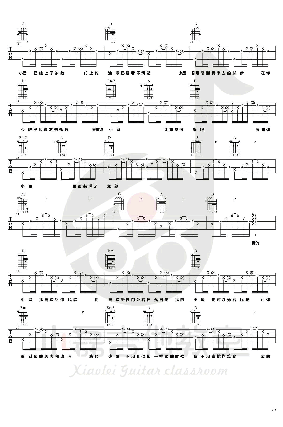 曲谱介绍: 赵雷《小屋》吉他谱,原调E,选调D调指法,变调夹夹二品。赵雷的一首好听的民谣歌曲,小屋吉他六线谱,小磊老师编配出品,91吉他谱网站上传更新。曲谱大量用到了16分音符和连线,还有前奏用到的勾弦技巧,让这首歌曲有了很强的练习意义。加上歌曲前后结构分明,最后一部分用到了扫弦,也为歌曲提升了层次,使得更值得琴友们学习。这里随谱附上配套吉他弹唱教学视频,方便大家参照练习。