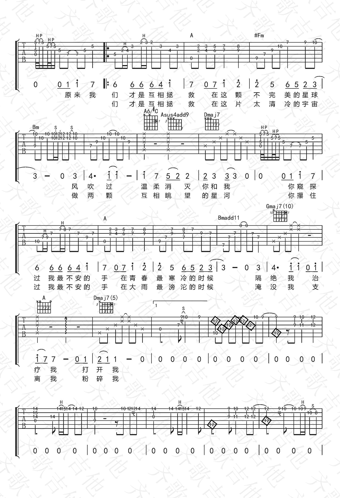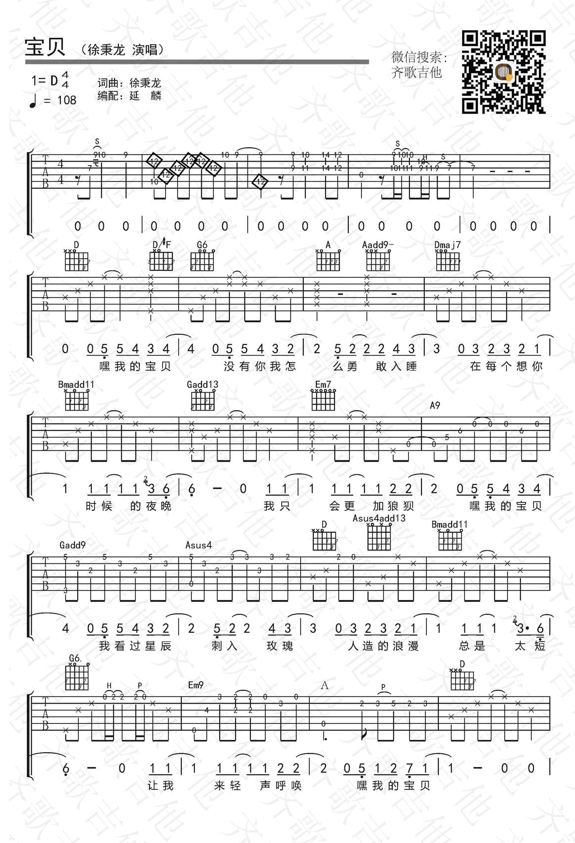 曲谱介绍: 徐秉龙《宝贝》吉他谱,一首排行榜靠前的新歌,宝贝六线谱,三张弹唱图片谱,感谢齐歌吉他编配出品,91吉他谱推荐分享。 延麟老师编配说明:原曲为D调,这是指弹演奏者比较偏爱的调式,不过与大多数指弹风格D调需要特殊调弦不同,这首歌曲是标准调弦。一级、二级、和五级的和弦根音都是空弦,所以你看到它在这首歌里有很多使用。 另外,有不少高把位的封闭和弦,虽然不能说有多难,但是把这首歌弹好还是需要一定基本功的。我在讲解的时候,没有把一些简单的技巧都讲解,因为如果你连击弦、滑弦、泛音这样的基础技巧还不知道的话,直接学这首歌曲是不合适的,还是要按步就班来。 需要说明的是,有一些的音可以在不同的指法安排出来,比如Bmadd11和弦,可以在第2品弹,也可以在第7品弹,那么就要根据指法的便利来决定。像副歌的时候第一个和弦G和弦,我也分别使用了两个把位的按法,你可以找一种你习惯的按法即可——不过,如果要细致来分的话,不同把位的弹法音色会有一些差异,不过在这里我就不去抠那么细致了,只要安排合理即可,演奏家们每次弹奏的把位也不会完全相同。 活学活用,知道原理,加以变化升华,才是最重要的。 示范和讲解:关注我一段时间的朋友都知道我拙劣的唱功了,请无视吧,最近,再加上入冬后就一咳嗽,一说话更容易咳,强压着气在唱,更惨不忍听啦。中间我的二丫头有一句话,“妈妈,饭洒了”。插在这首歌里,倒显得挺合主题了。 现在在内蒙古,手里只有一把打品的破旧合板琴,凑和听听演示好了,主要是放送的谱子嘛,也是做了差不多一天的时间,希望大家从中学到东西,不枉花的这些时间了。 本来说近期不想录东西了,不过为了大家学习方便,还是录吧。虽然声音,画面质量不高,还总有宝宝不听话时不时插上一嘴,不过有总比没有强。