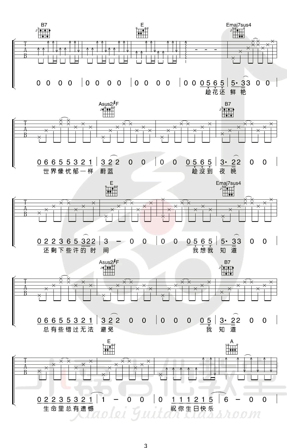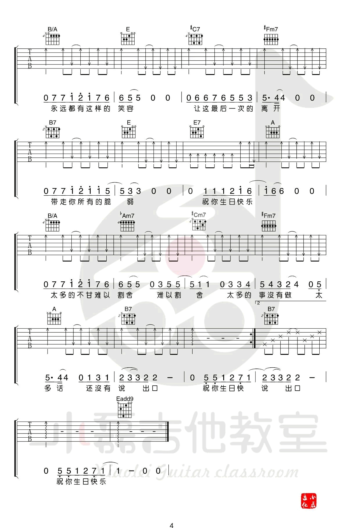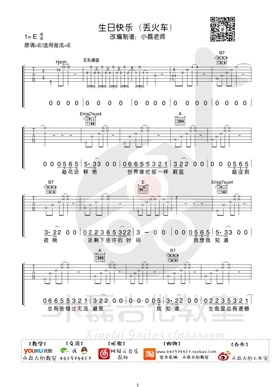 曲谱介绍: 《生日快乐》吉他谱,丢火车乐队演唱的一首民谣风格的歌曲,生日快乐六线谱,原版编配,高清图片谱。这是一首E调编排的歌曲,整体和弦走向会有一些大横按和弦,这是不可避免的!很多同学可能觉得和《春风十里》比较类似,但是还有些小不同的!我们也从这首歌中感受到了作者的和弦编配套路,也是可以帮助我们学习与理解和声编配的走向的!后段的扫弦比较简单,整体难度可以针对前奏和和弦按法练习!难度:6级。感谢小磊吉他编配出品,随谱附上配套《生日快乐》吉他教学视频。