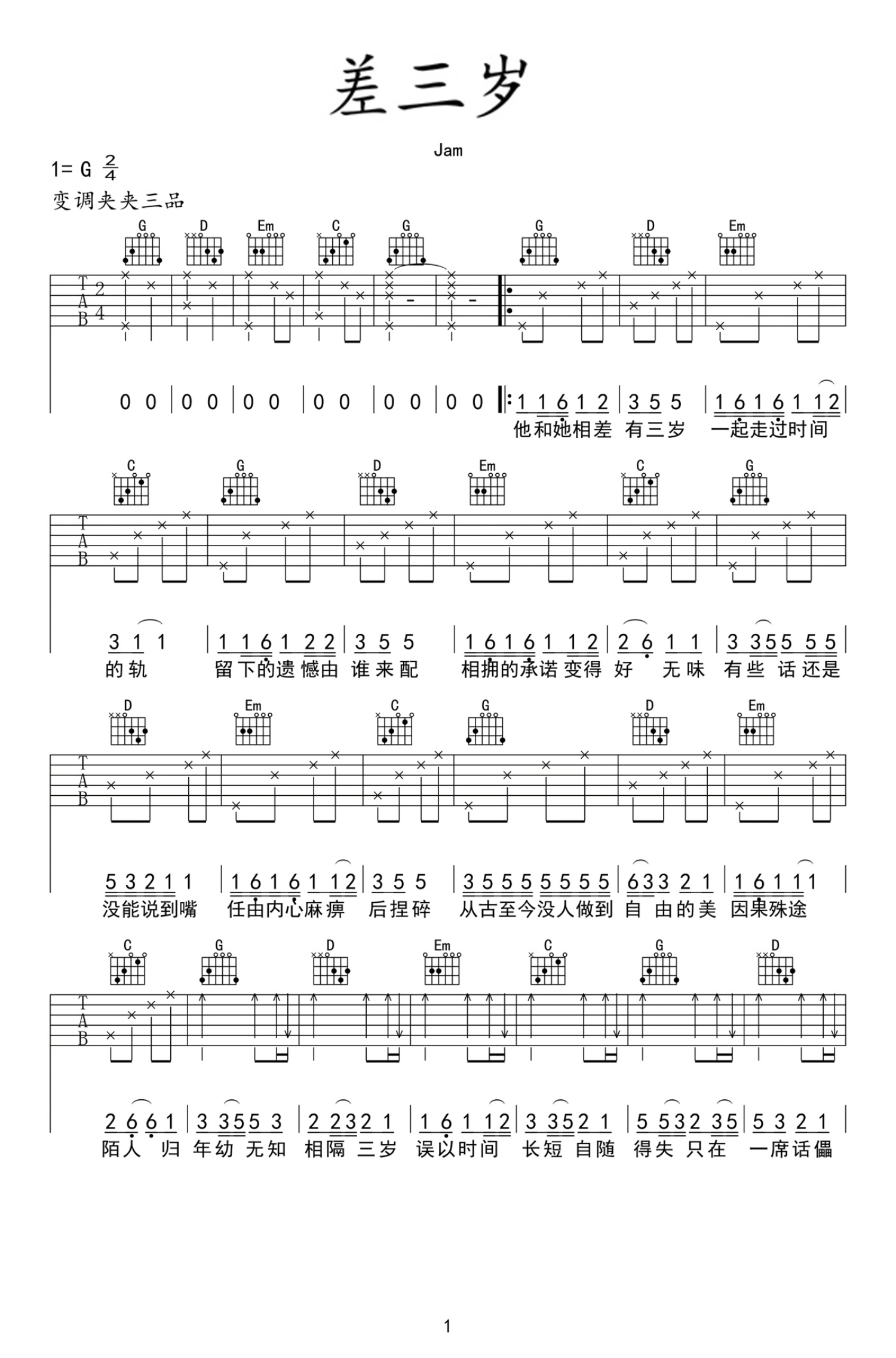 差三岁吉他谱 - JAM - G调吉他弹唱谱