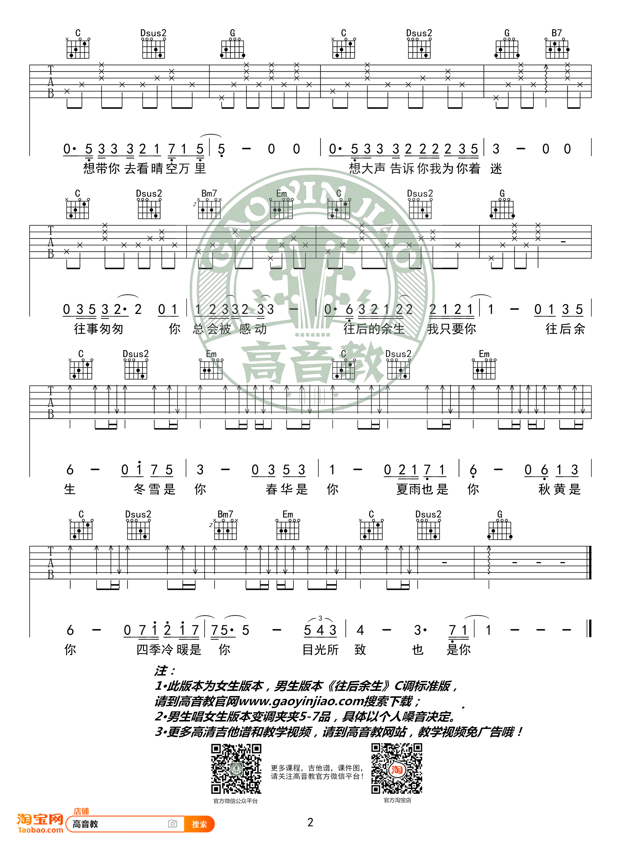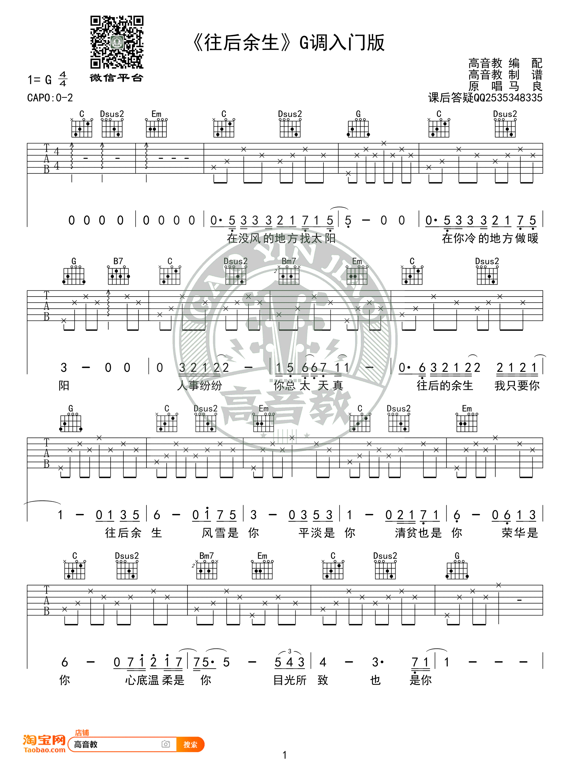 曲谱介绍: 往后余生吉他谱,马良的一首柔情尽诉的民谣创作歌曲,选用G调指法编配,弹唱入门版,Capo夹0-2品。往后余生六线谱,高清图片谱,感谢高音教出品,91吉他谱网站上传分享。 这首歌惊艳的地方就在于用最简单的词叙说最真挚的感情,让人感动产生共鸣。愿我能找到如歌词里那般和我共度余生的人,愿所有善良的男孩女孩们都可以被温柔以待,愿所有苦苦的等待和努力,最终都不会被辜负。