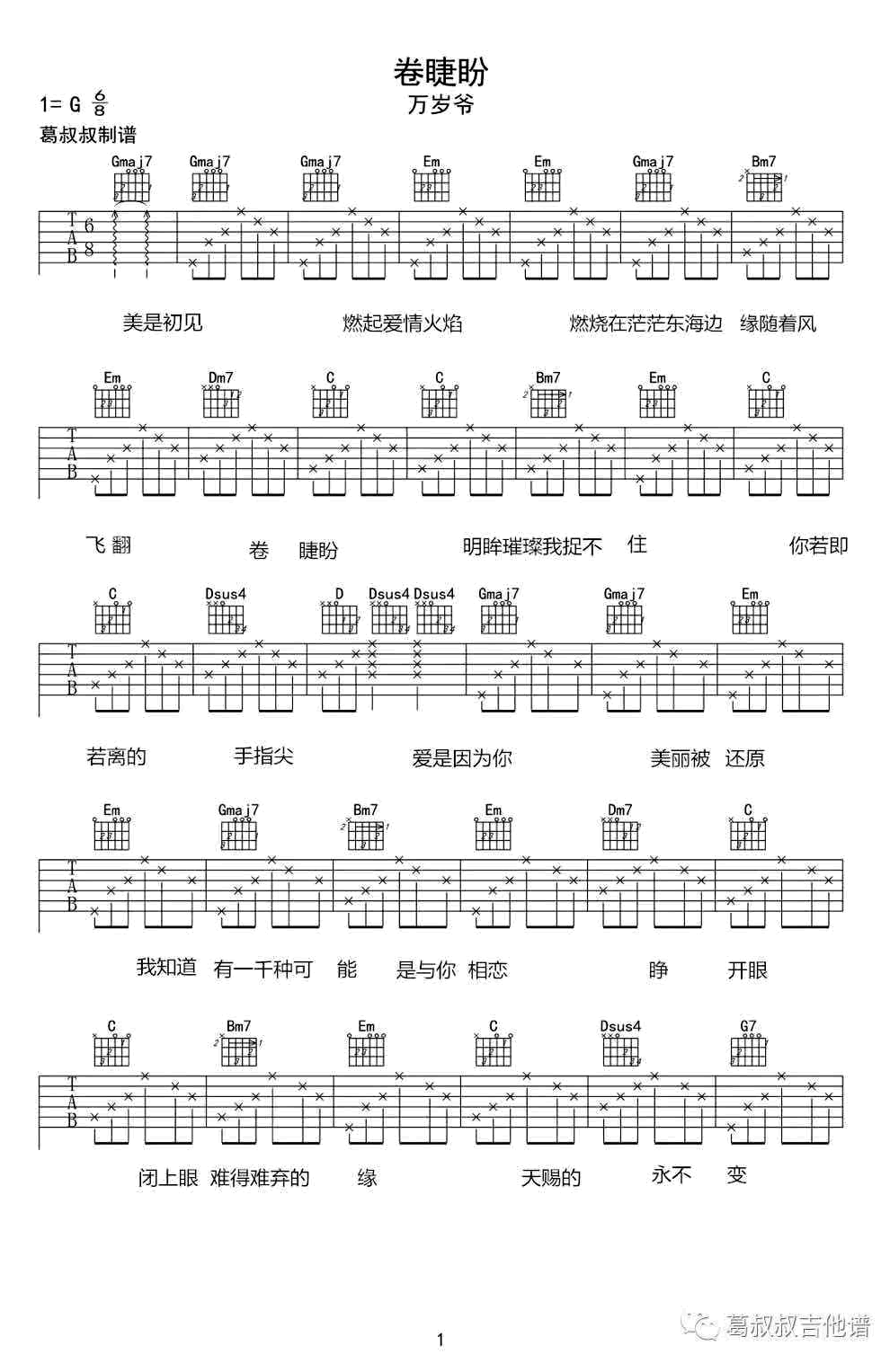曲谱介绍: 卷睫盼吉他谱,G调指法,电视剧《春光灿烂猪八戒》片尾曲,万岁爷万玲琳翻唱,卷睫盼六线谱,葛叔叔制谱,91吉他谱上传分享。 一首经典的老歌让人感怀,年幼时不懂爱情,却仍被电视剧里面猪哥哥和小龙女的故事感动。如今多年后再听,唯叹青春不再,时光荏苒。