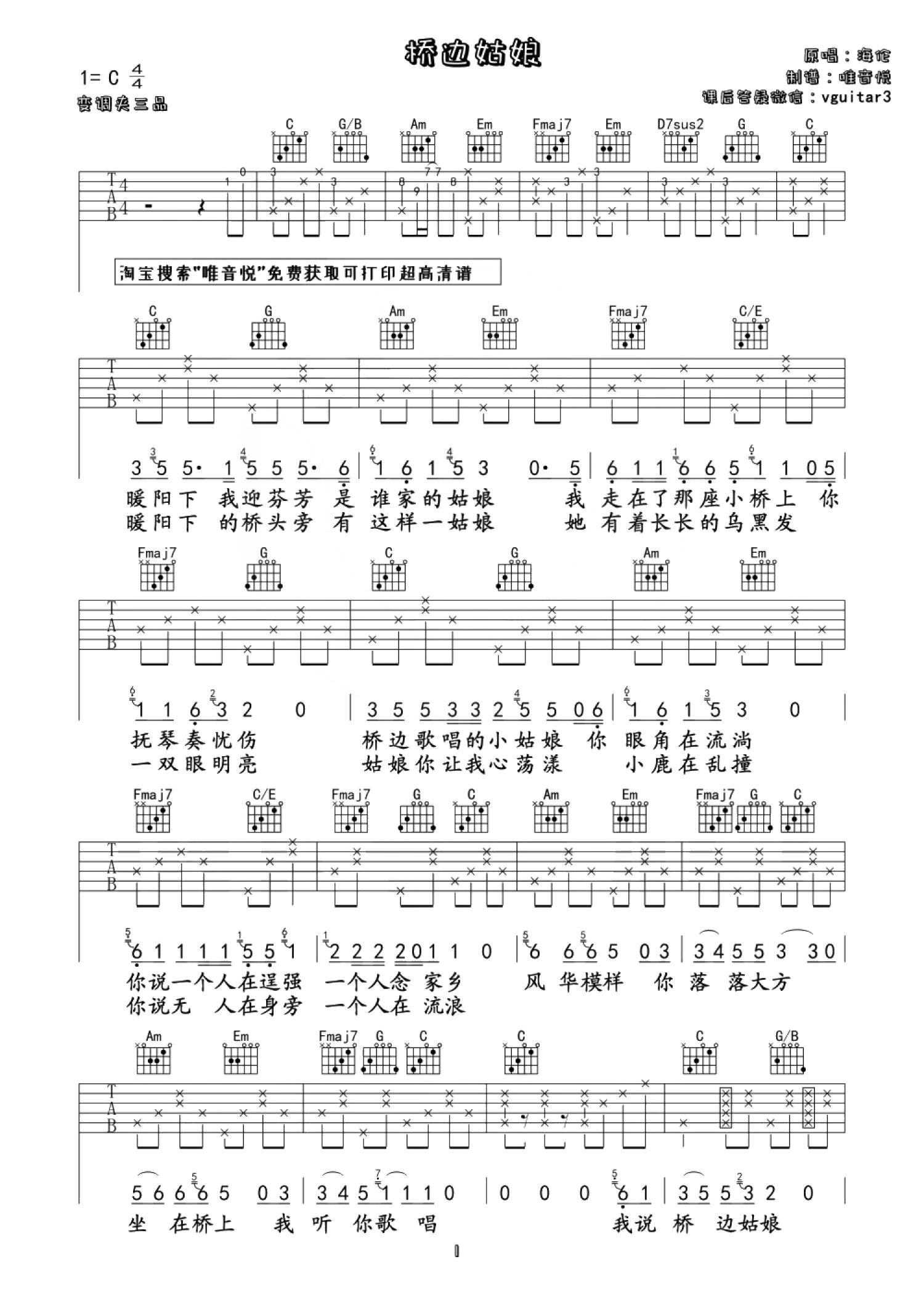 曲谱介绍: 海伦《桥边姑娘》吉他谱_C调吉他弹唱谱