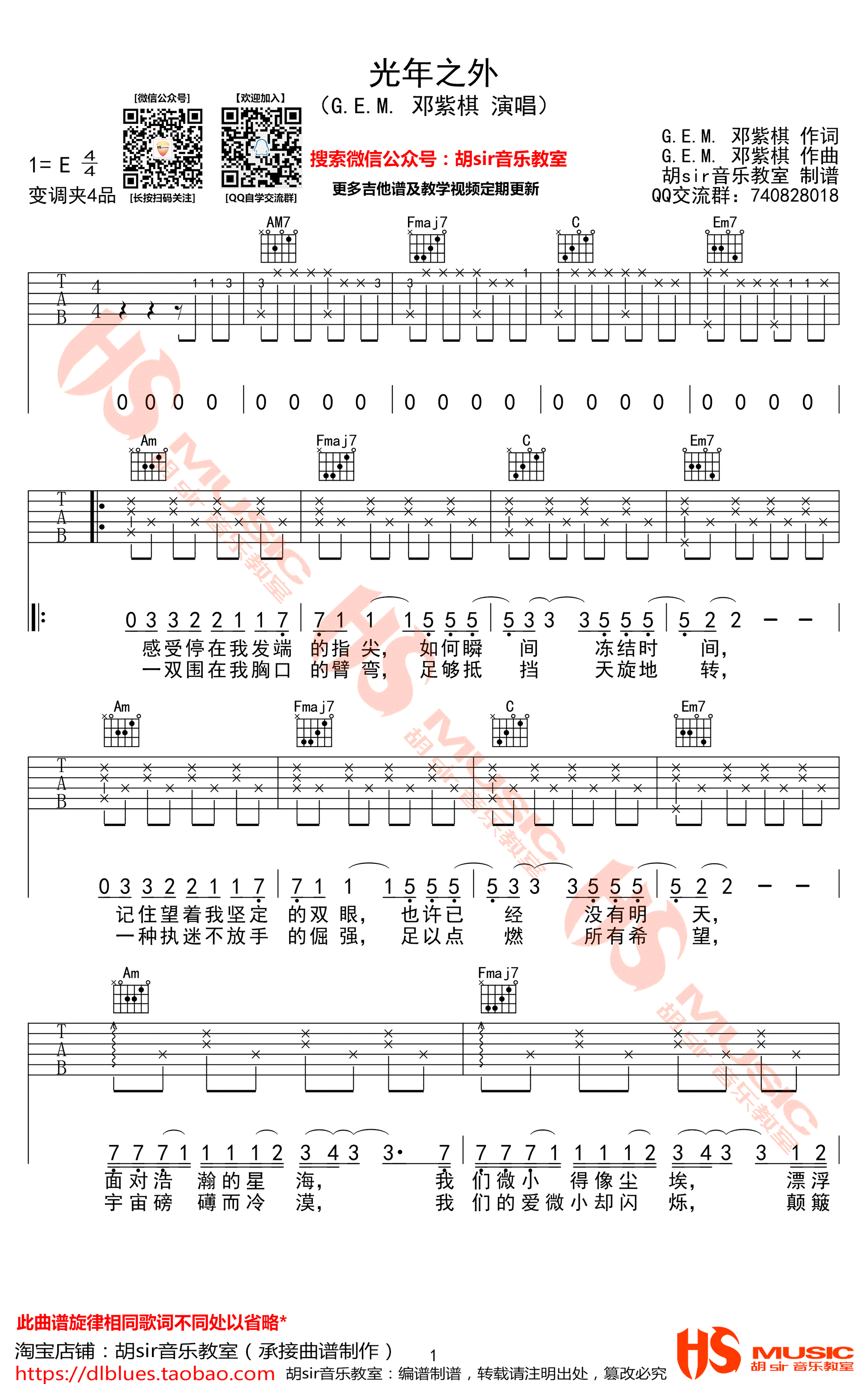 曲谱介绍: 光年之外吉他谱,邓紫棋演唱,E调弹唱谱,变调夹夹第四品,电影《太空旅客》中国区主题曲,光年之外六线谱,三张弹唱图片谱,胡sir音乐教室出品,91吉他谱网站上传推荐。随谱附上配套吉他弹唱演示视频,欢迎琴友们扫码关注支持,一起学习91吉他谱。