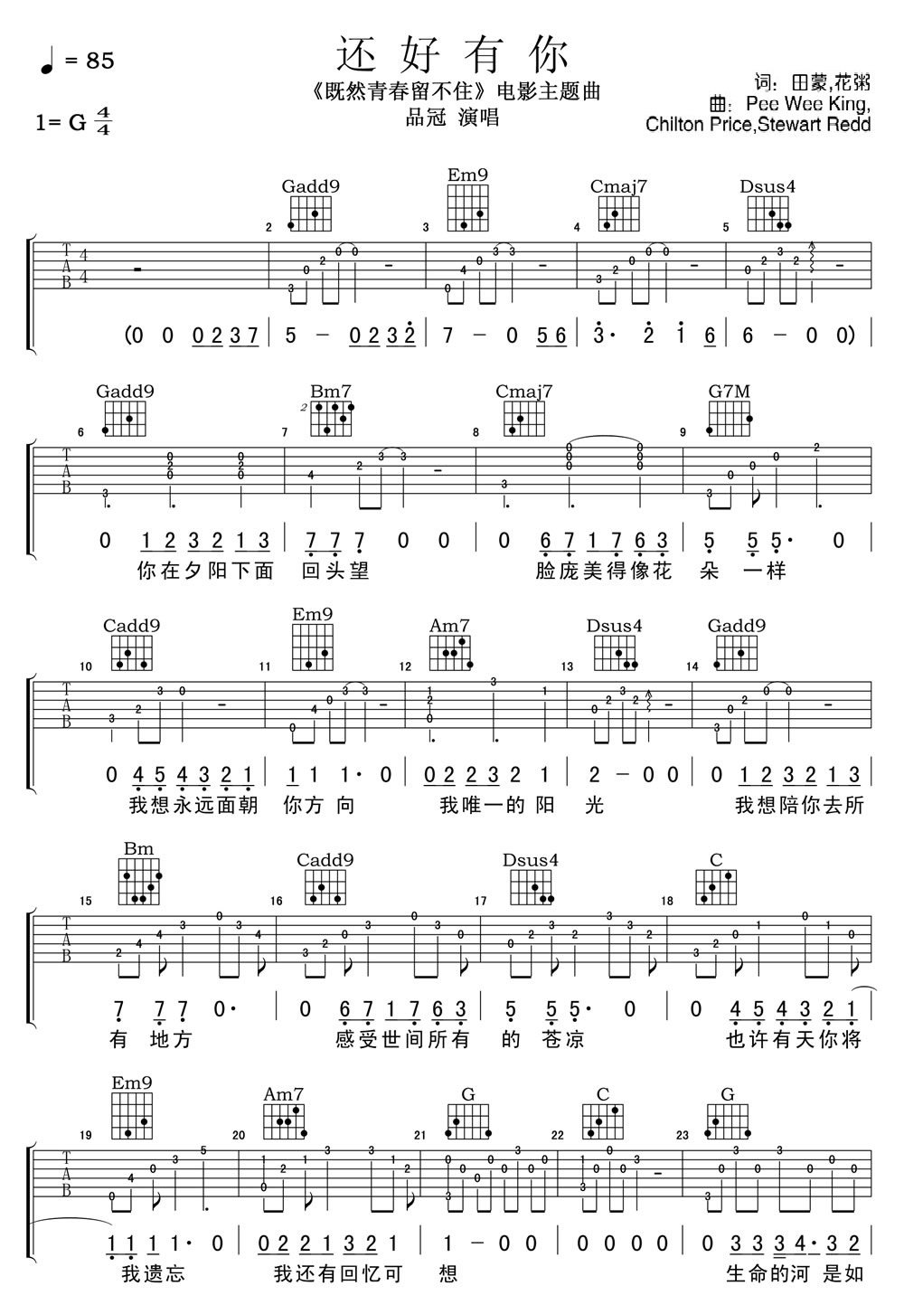曲谱介绍: 品冠还好有你吉他谱,电影《既然青春留不住》主题曲,还好有你六线谱,G调编配高清图片谱。品冠温暖的声音有抚慰人心的作用,纯净透彻的声线,安静治愈,会让你觉得这个世界非常美好。 品冠当初听到歌曲DEMO时只有简单的吉他版本,随着看电影初剪后便 让他立刻掉入青春回忆的情怀中,尤其歌词中写道「我想陪你去所有地方感受世间所有的苍凉」,让品冠感触特别深刻,因此在演唱制作歌曲时加入弦乐演奏编曲,让歌曲更加充满温暖情感。