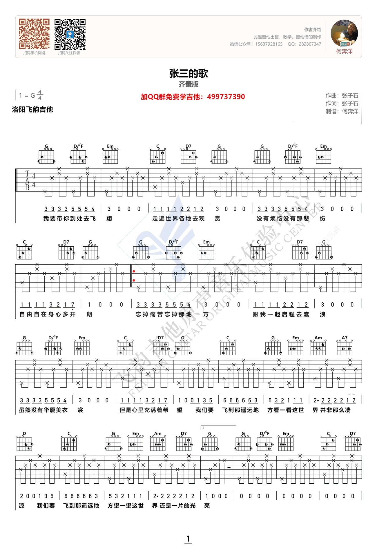 曲谱介绍: 《张三的歌》吉他谱,齐秦演唱的一首经典老歌,张三的歌六线谱,G调指法,无前奏间奏简单版编配,洛在民谣出品,91吉他谱网站上传分享。 老师演奏说明:曲谱改编自齐秦《我是歌手》现场版,D/#F和弦用左手大拇指按六弦二品,也可以用四弦空弦代替。