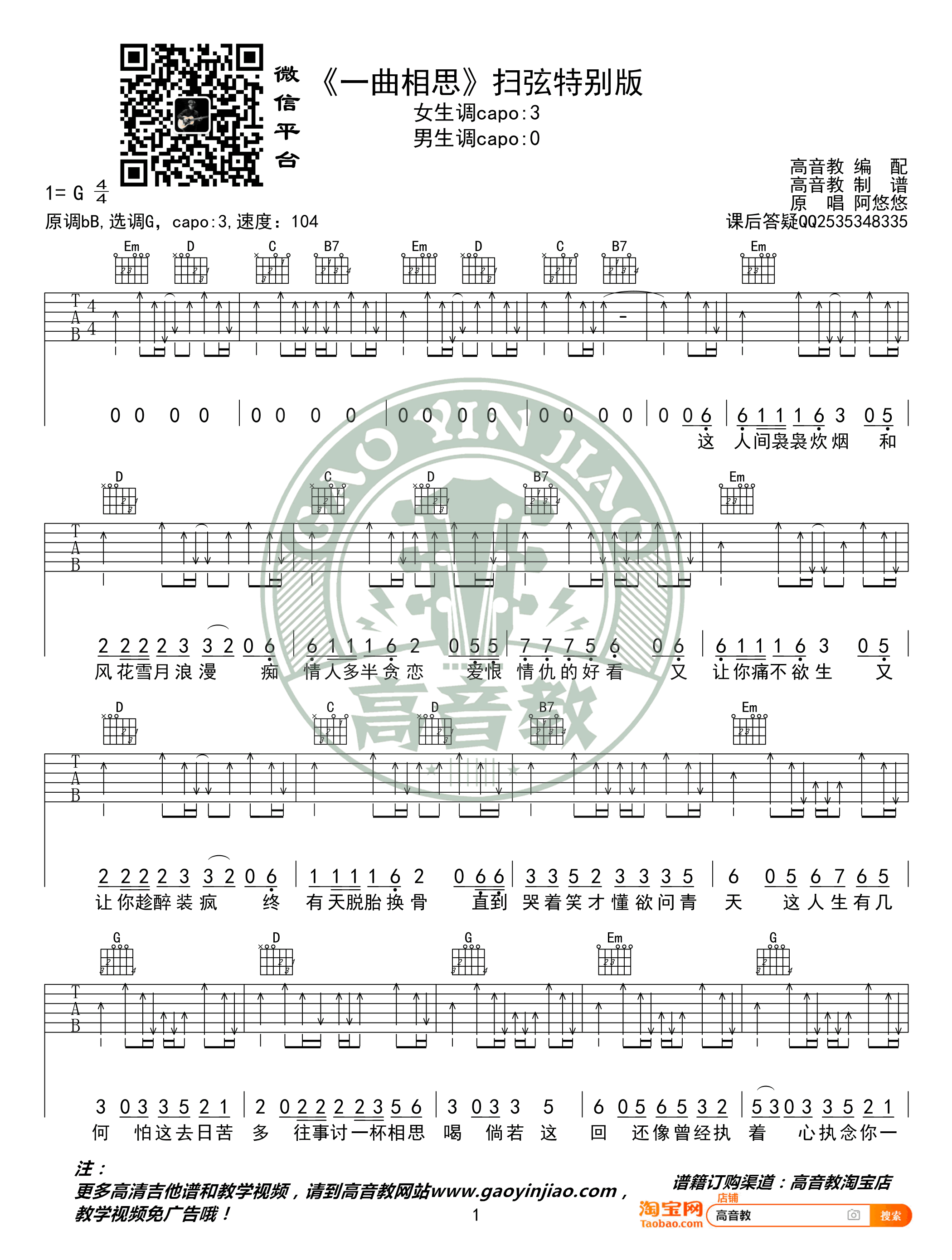 曲谱介绍: 一曲相思吉他谱,半阳/阿悠悠演唱,一曲相思六线谱,原调bB,选调G,扫弦版编配,女生调Capo夹三品,男生调不用夹,高音教出品,91吉他谱网站上传。 这人间袅袅炊烟,和风花雪月浪漫。痴情人多半贪恋,爱恨情仇的好看。阿悠悠小姐姐在同学的婚礼上唱歌助兴,一首《一曲相思》惊艳全场,引抖音网络平台翻唱热潮。