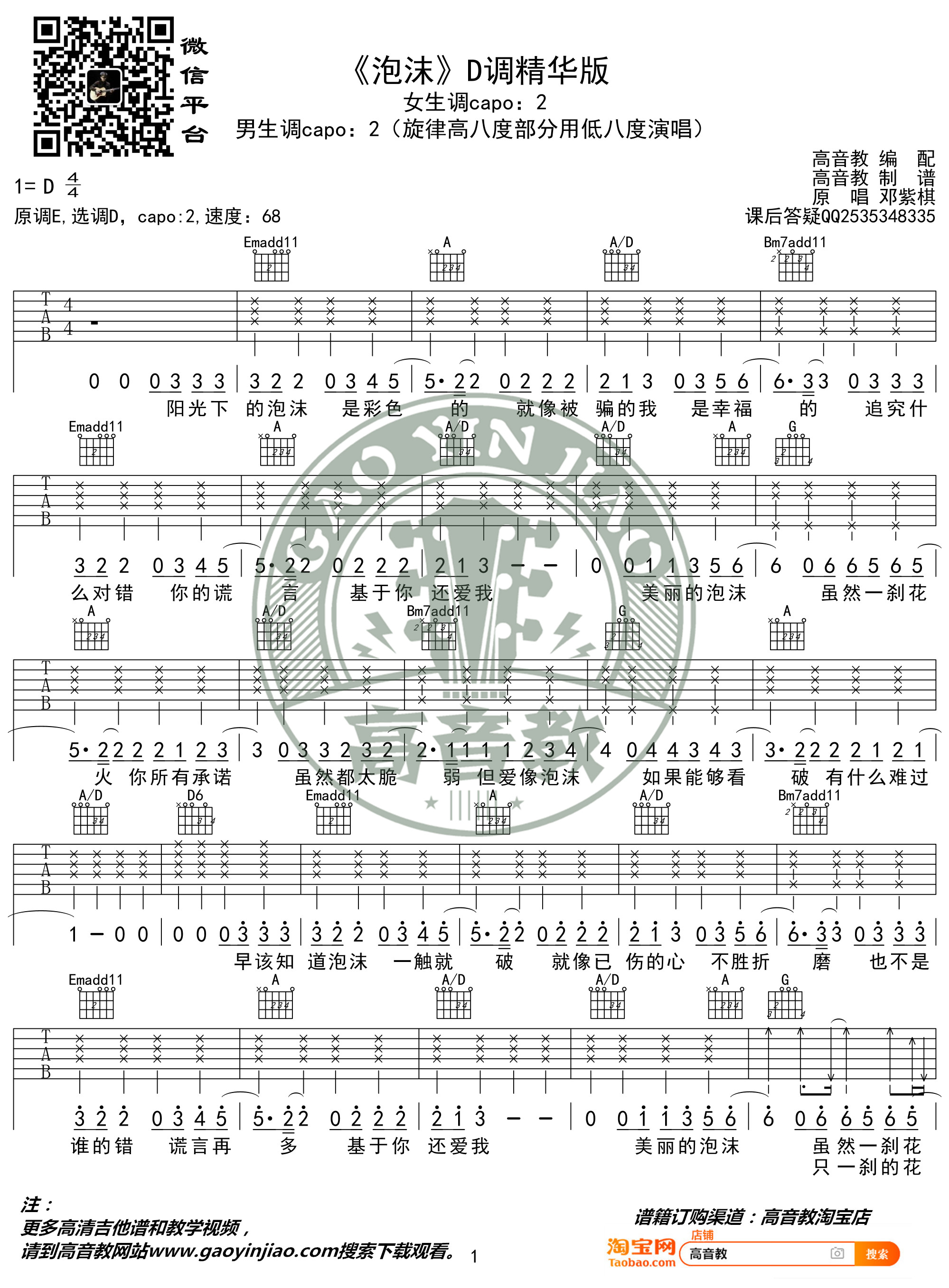 泡沫吉他谱 - 邓紫棋 - D调吉他弹唱谱