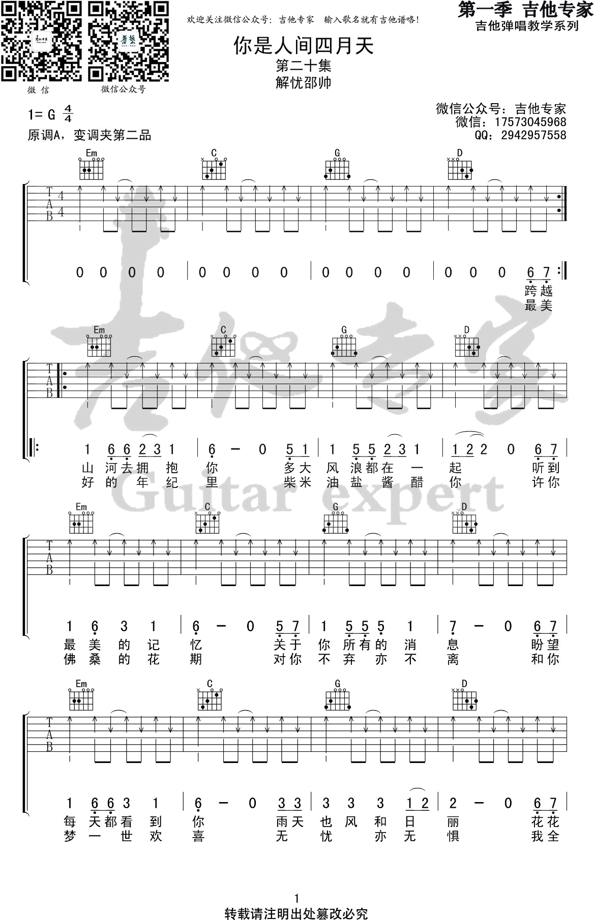 你是人间四月天吉他谱 - 解忧邵帅 - G调吉他弹唱谱