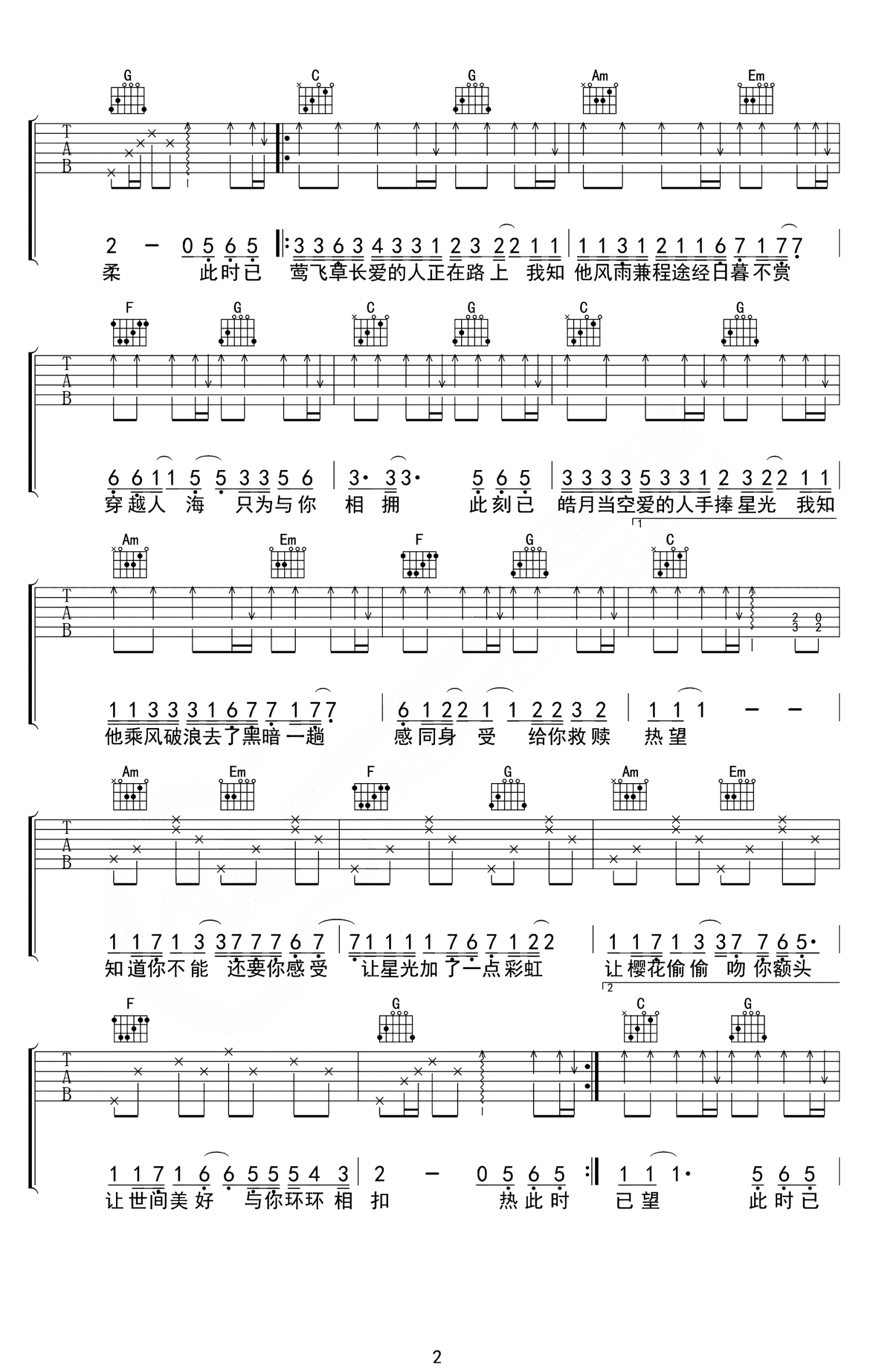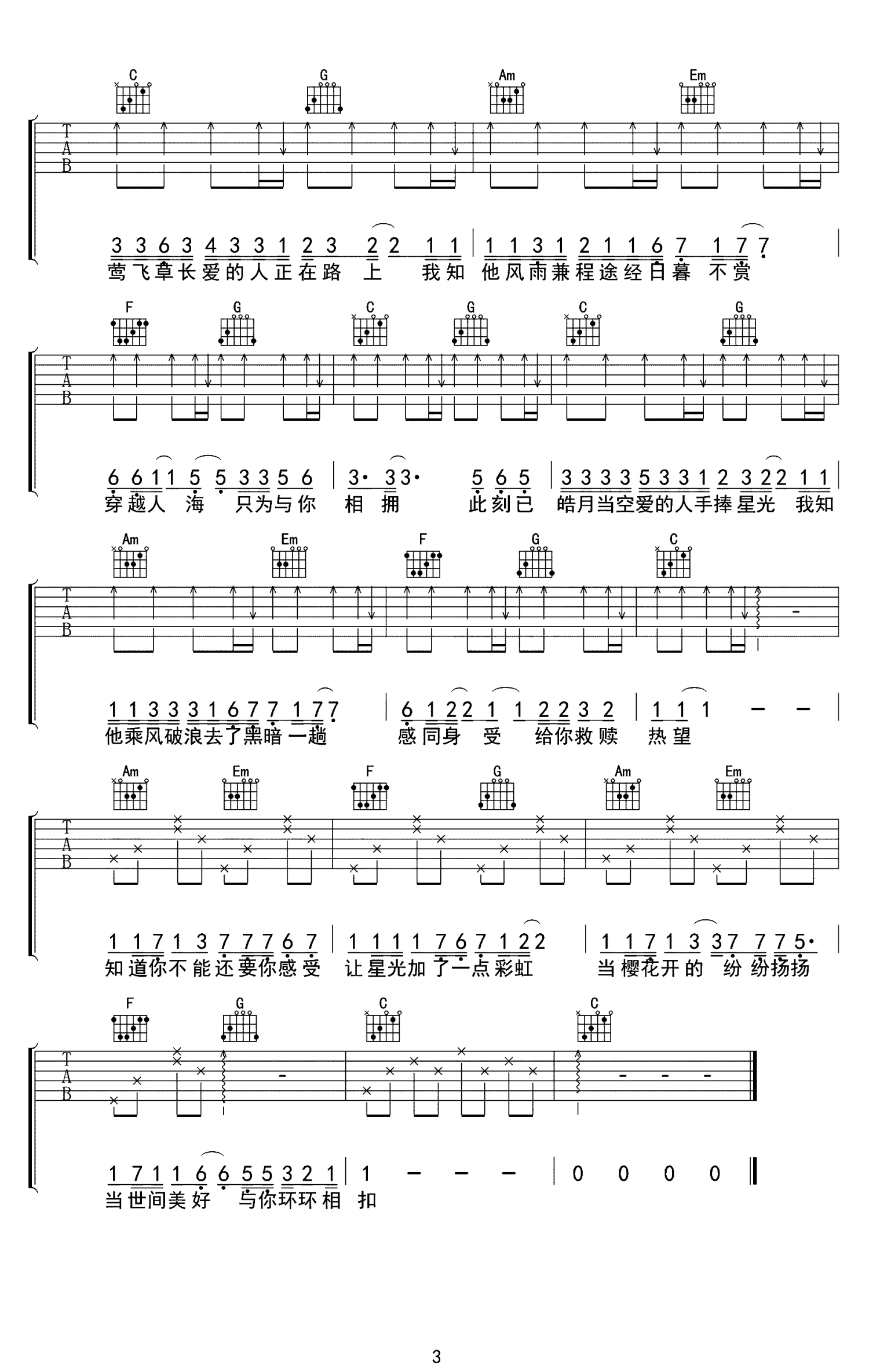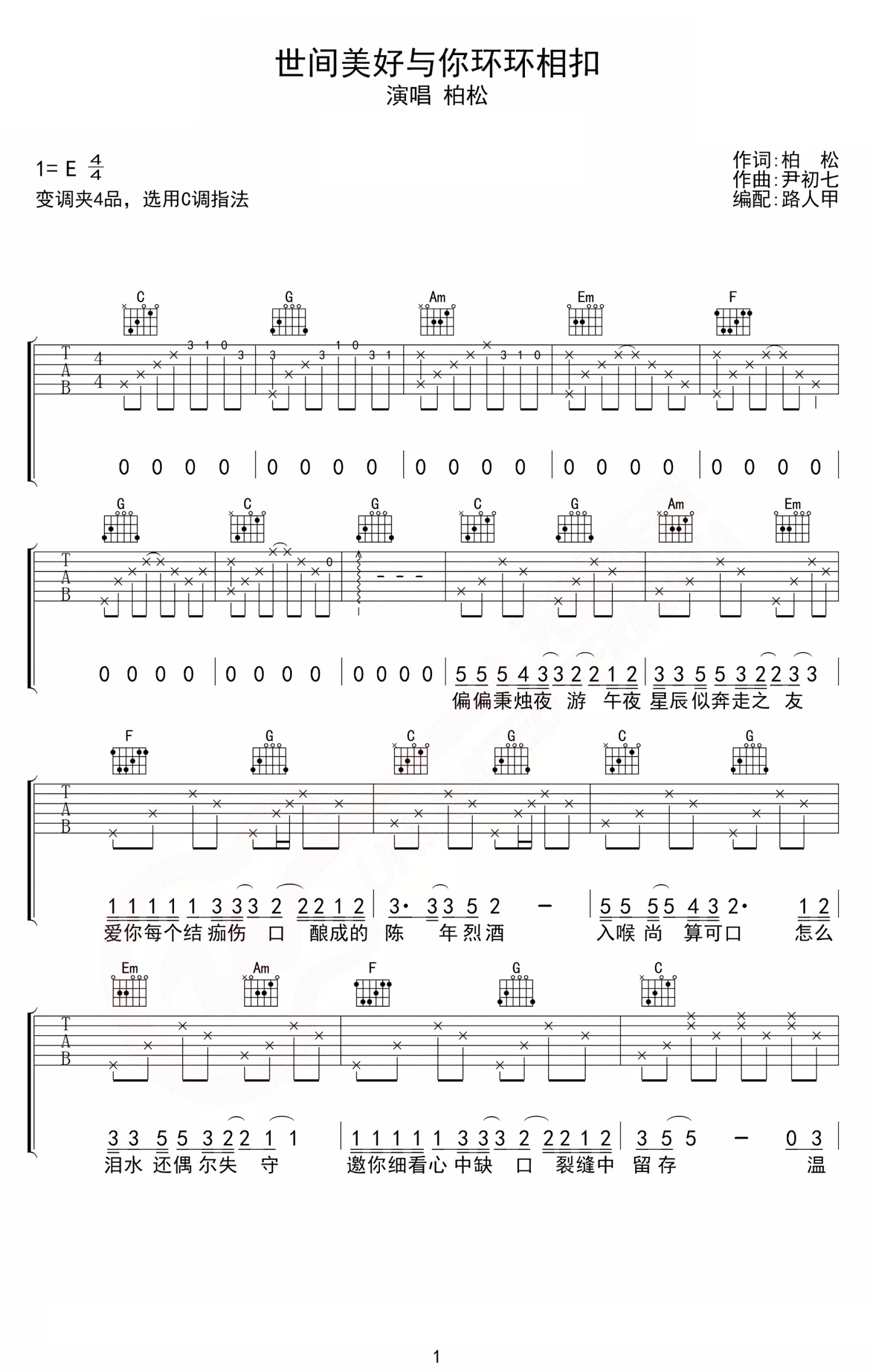 曲谱介绍: 此时莺飞草长,爱的人正在路上,愿世间的美好,与你环环相扣,推荐美的像诗一样的歌曲《世间美好与你环环相扣》,温暖这个骤冷的秋天。 如果世间没有治好一切的药,但至少有很多的止疼片,比如音乐和月色。哪怕现在的生活糟糕透了,我们还是要拍拍肩上的灰,满怀希望迎接明天,愿世间美好与你环环相扣。,C调高清版六线谱,原调E调,弹唱变调夹夹第四品。