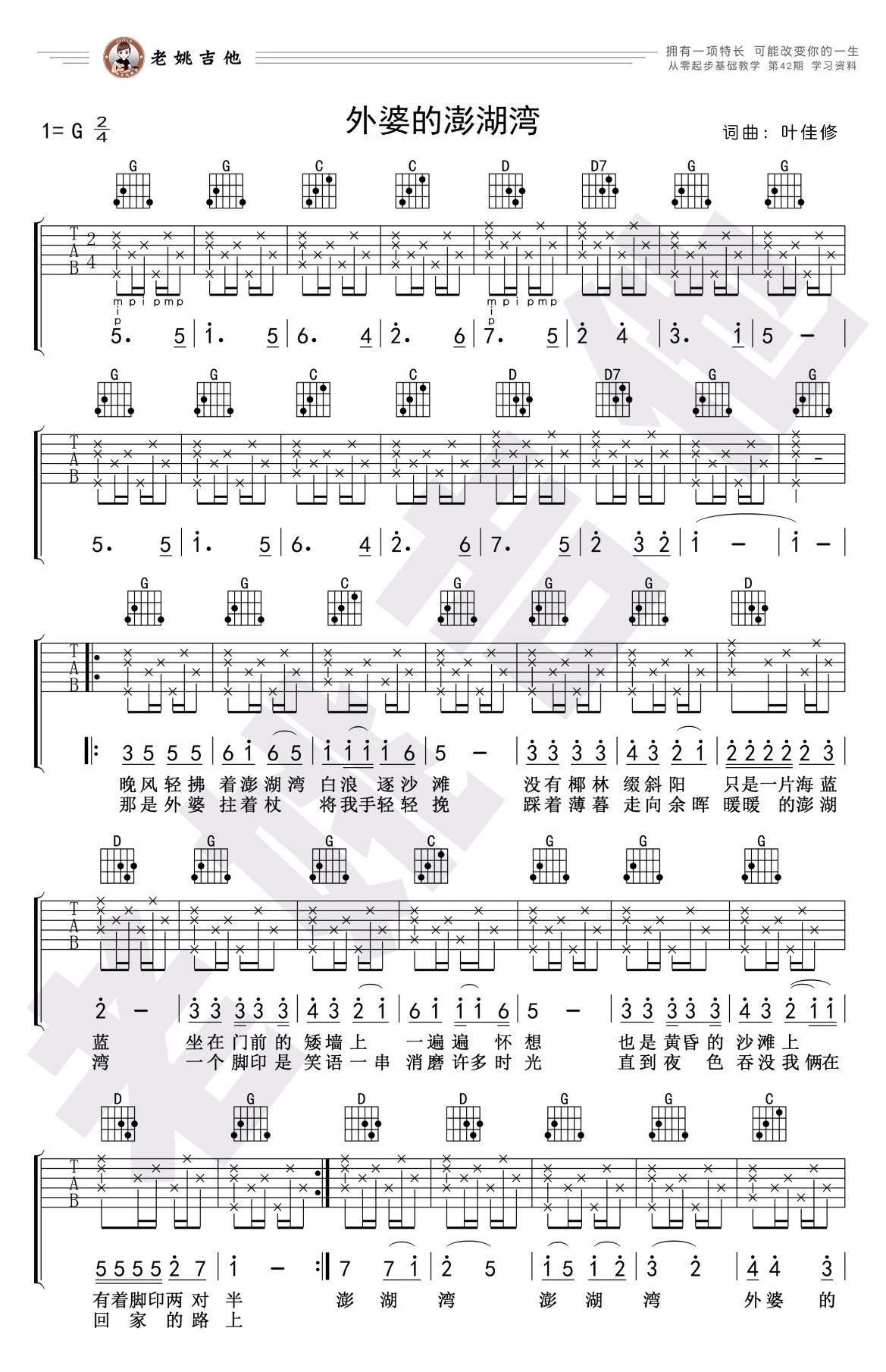 曲谱介绍: 外婆的澎湖湾吉他谱,一首台湾校园民歌,G调指法编配,外婆的澎湖湾六线谱,老姚吉他编配出品,随谱附上吉他弹唱教学视频,配合歌曲带琴友们了解掌握右手复杂节奏练习。91吉他谱网站推荐分享。一代人记忆中的经典,原唱潘安邦,翻唱者众多,包括刘文正、蔡琴、张明敏,每当那温馨熟悉的旋律,又一次在耳畔响起,都唤醒我们珍藏心底的美好回忆。