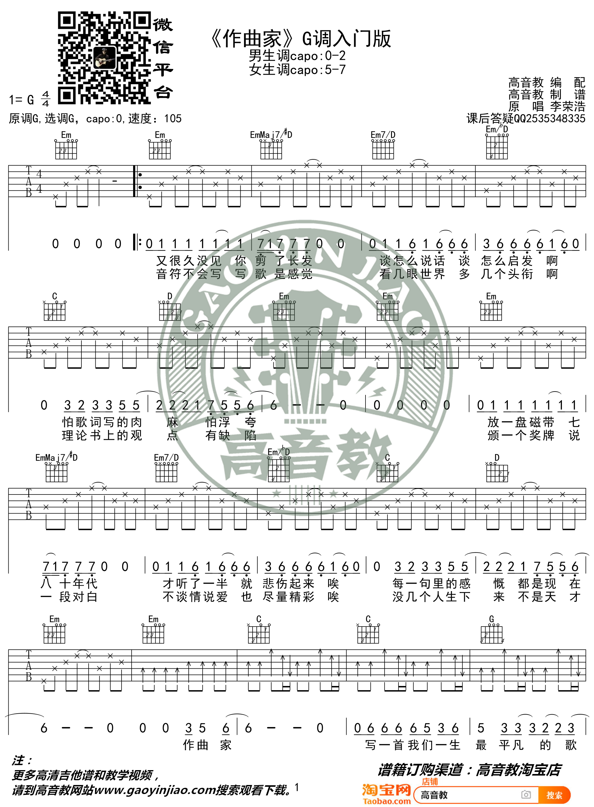 曲谱介绍: 《作曲家》是李荣浩创作并演唱的歌曲,收录于李荣浩2014年3月4日发行的同名EP《作曲家》中,后来又收录于李荣浩同年11月28日发行的专辑《李荣浩》中 。 2015年,在首届独立音乐盘点上该曲被评为“2014年度Top20金曲”。 李荣浩在结束专辑《模特》的宣传工作后,又继续着音乐制作人的工作,一边为电影创作主题曲,一边为艺人制作主打歌,在自我创作与为他人创作的两种思维转换下,他不断以旁观者的角色去清醒的看待自己内心的变化,感受生活的每一个细节,于是《作曲家》这首歌的概念和旋律就这样自然而然的孕育而生,歌曲里包含他对于简单最快乐的理解。他希望借该曲去提醒自己和每个人:其实抛弃一些矫情的身份修饰,不在刻意制造人生伪高潮,去直面真实自我,人人都是自己乐章的《作曲家》。