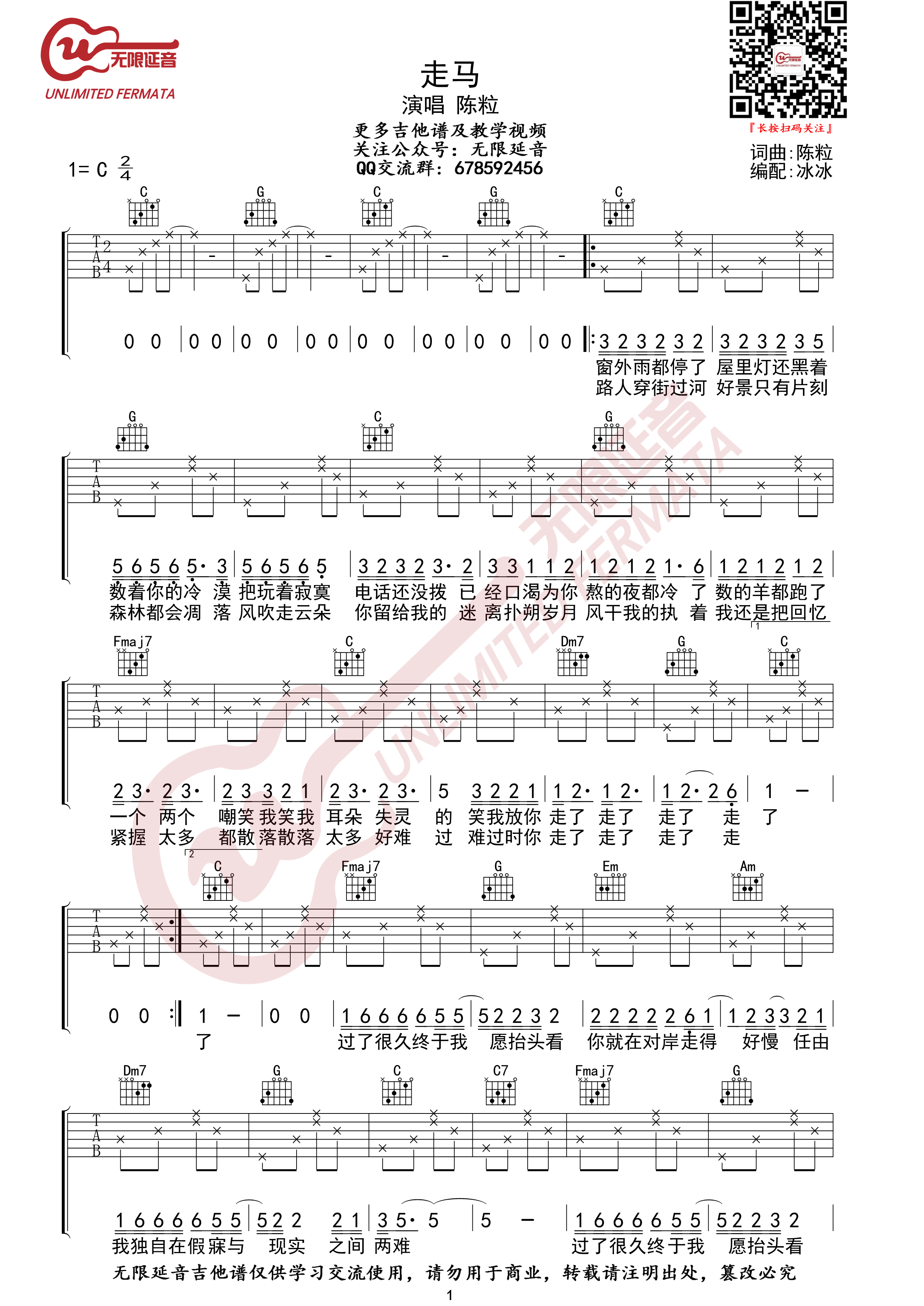 曲谱介绍: 走马为陈粒首张专辑《如也》 中的曲目。专辑发行时间为2015年2月2日。歌曲《走马》清新靓丽,坚定了陈粒演唱的曲风,形成自己的风格。