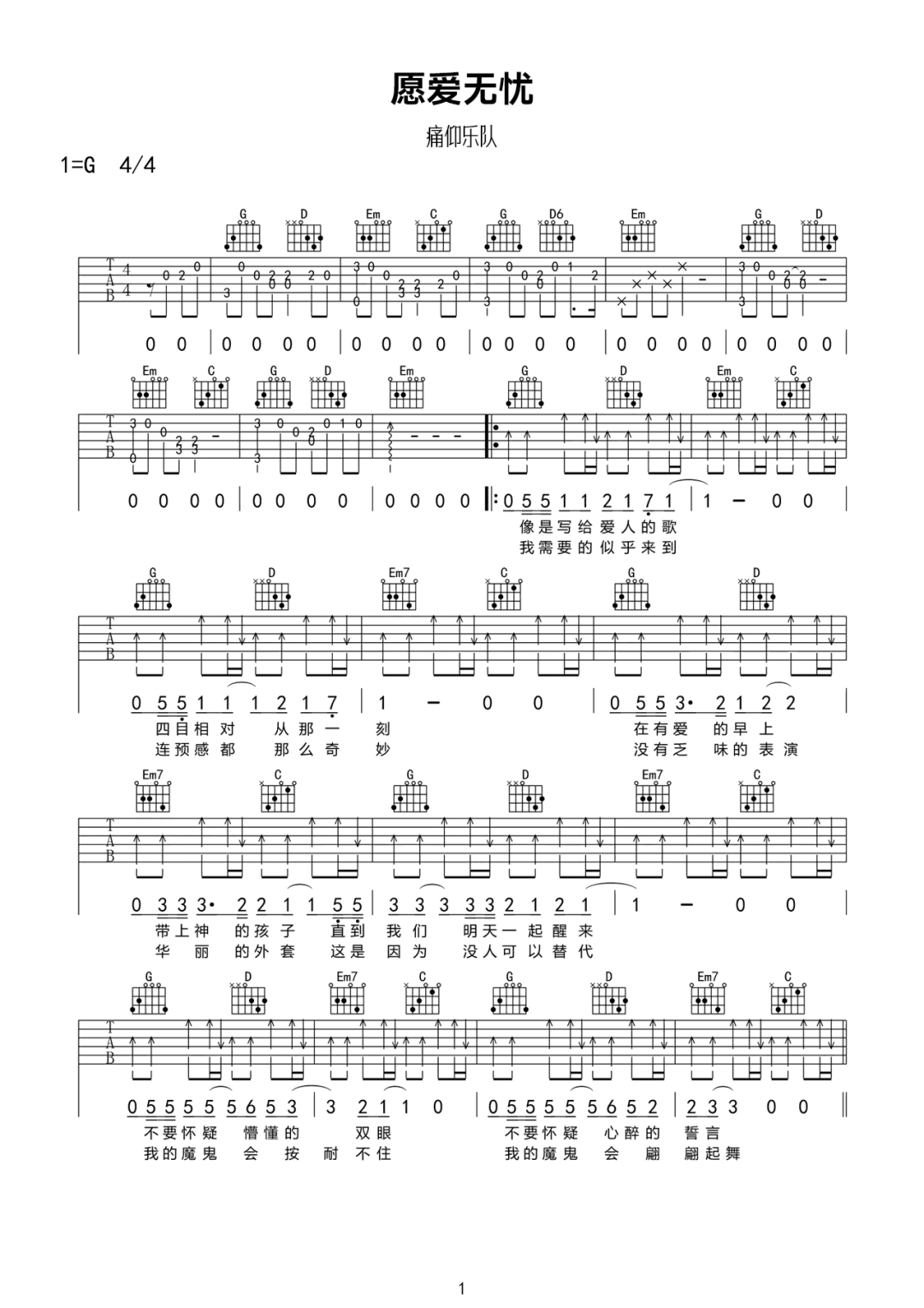 愿爱无忧吉他谱 - 痛仰乐队 - G调吉他弹唱谱 - 原版