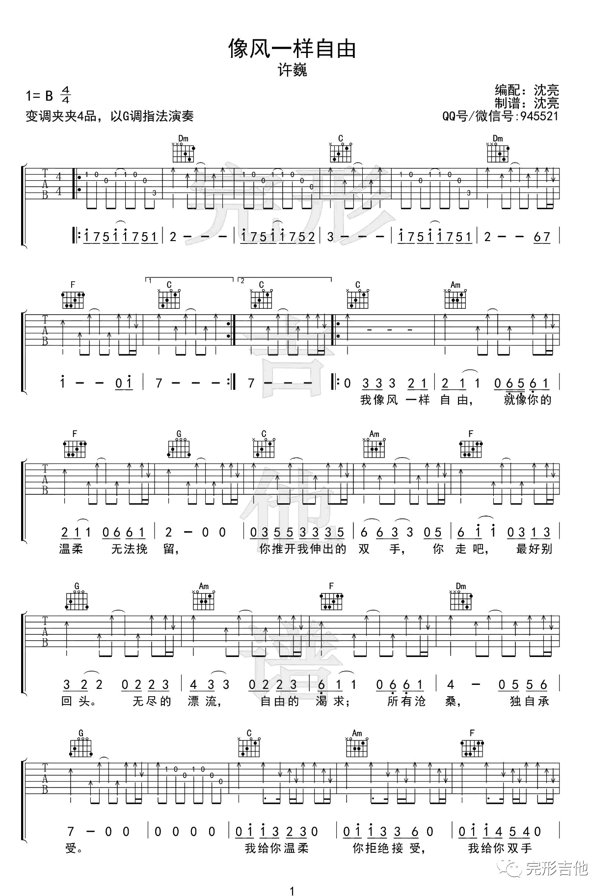 曲谱介绍: 吉他谱介绍:像风一样自由吉他谱,许巍演唱的一首歌曲,4/4拍的节奏,这首歌曲的原调为B调,这里曲谱采用了G调指法进行编配,演唱时夹变调夹4品可回到原调,也可根据个人实际嗓音情况选择。曲谱由琴谱网更新上传,共2张高清图片弹唱吉他谱例,来源于@完形吉他编配出品。人们渴望像风一样自由,却总被束缚在生活的杂草堆里,如果勇敢行走远方,将会看见不一样的风景。 像风一样自由吉他弹唱教学