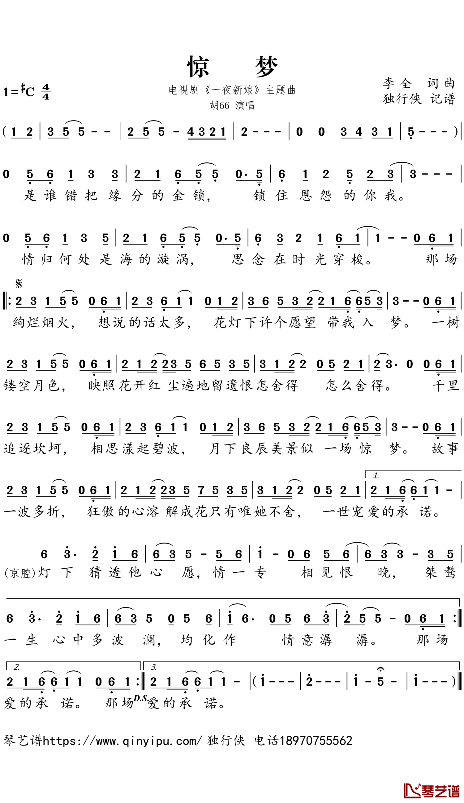 曲谱介绍: 胡66《一夜新娘》歌词_简谱