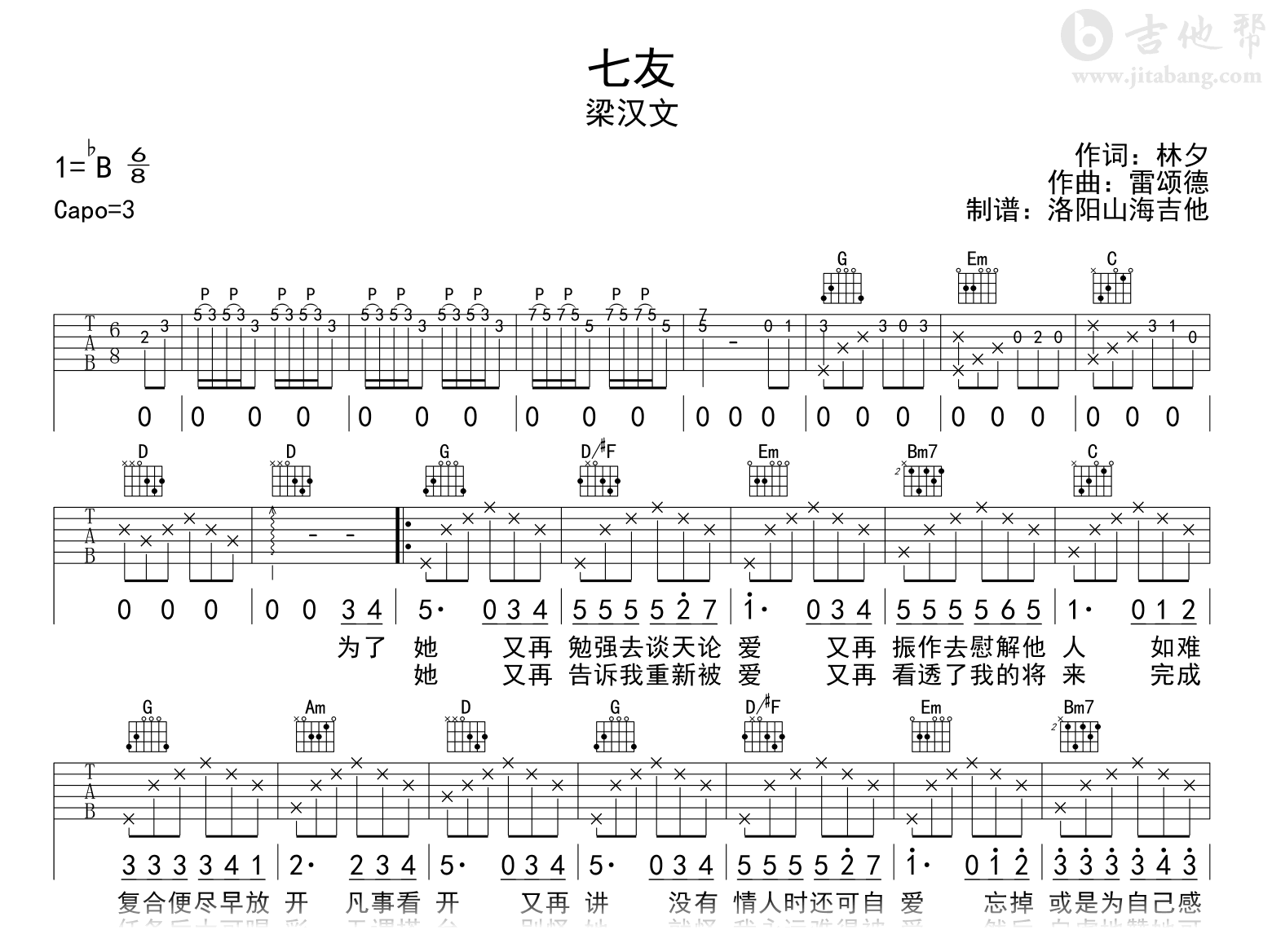 曲谱介绍: 七友吉他谱,梁汉文的一首经典粤语歌曲,忧伤的歌声,唱尽了暗恋一个人的苦楚心声。《七友》吉他弹唱谱,原调bB,选用G调和弦指法,六线谱高清图片共两张谱例。