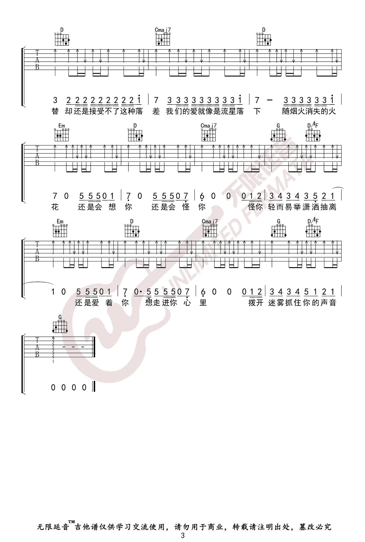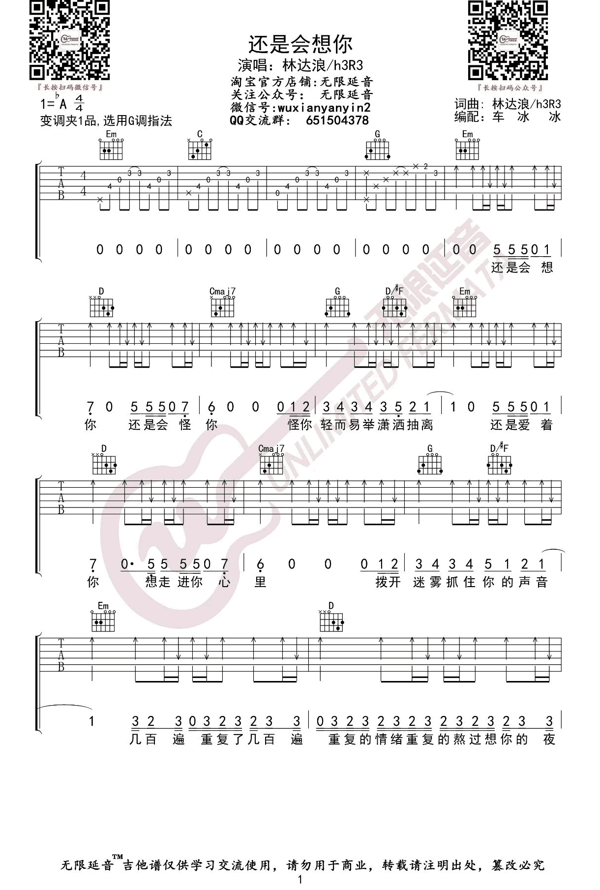 曲谱介绍: 还是会想你吉他谱,林达浪/H3R3的一首网络热门歌曲。还是会想你六线谱,原调降A选调G,CAPO夹一品,三张弹唱图片谱例。这首歌倒计时般的前奏开端,像是某个不幸预言兑现一样。逼近情绪最后一道设防,旋律准确击中那颗不安的心脏,那些琐碎的过去与眼前的斑驳陆离,交错闪现。没有思念的止痛药,只有刹那灰飞烟灭的决绝。一味的小心翼翼,却换来对方竭尽全力的抽离。