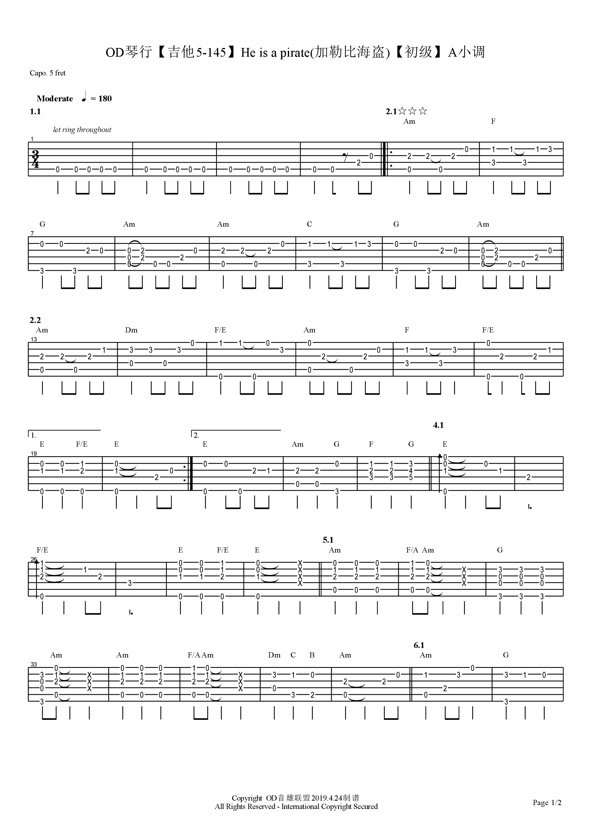 he is a pirate吉他谱 - 加勒比海盗配乐 - 吉他独奏谱