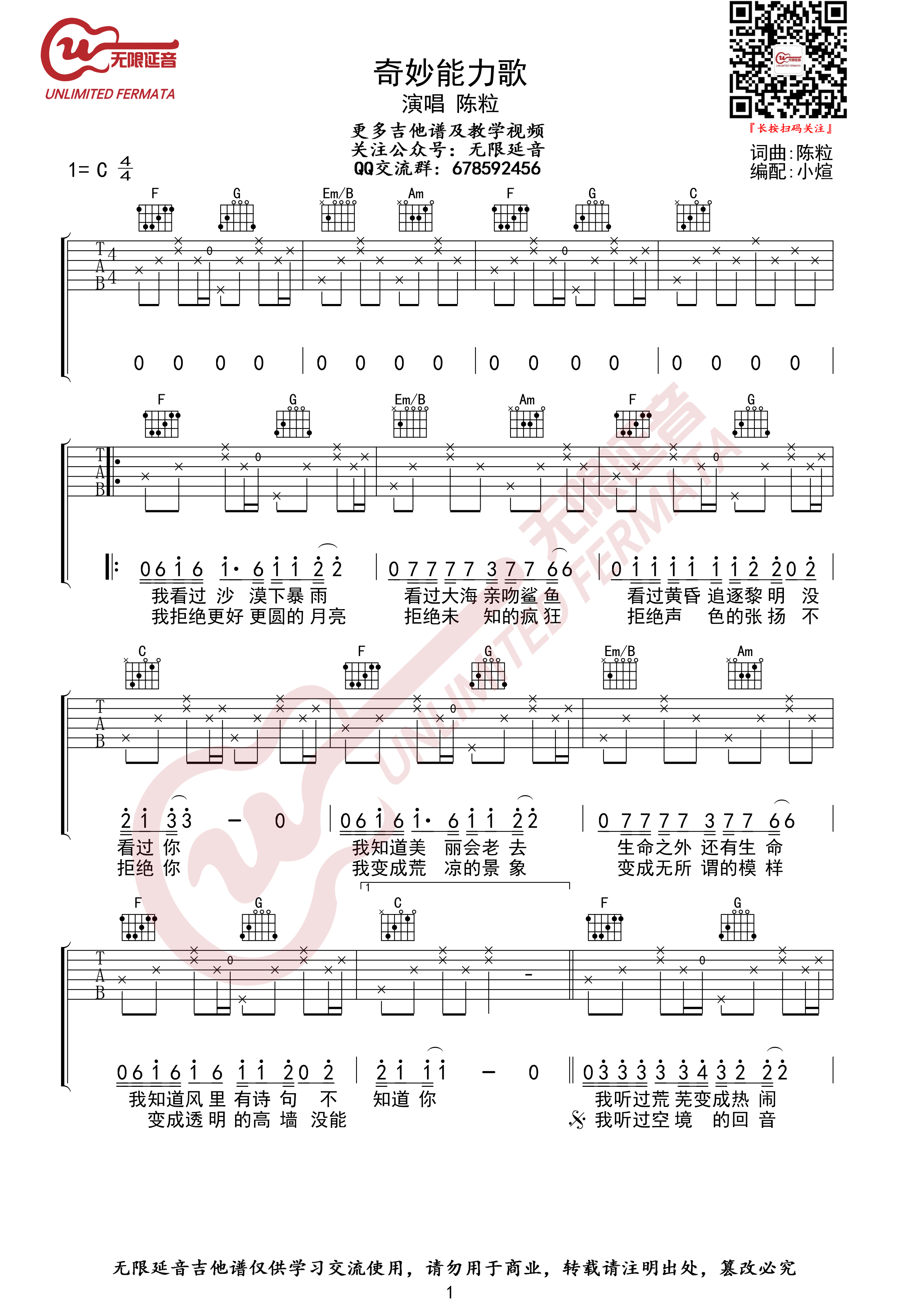 曲谱介绍: 《奇妙能力歌》是由陈粒作词、作曲并演唱的歌曲,收录于2015年2月2日陈粒发行的专辑《如也》中。  《奇妙能力歌》入围第四届阿比鹿音乐奖最受欢迎民谣单曲,并获得了第五届阿比鹿音乐奖最受欢迎民谣单曲。