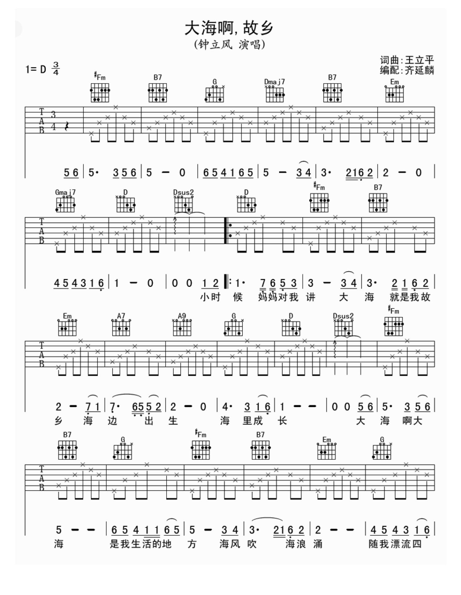 大海啊故乡吉他谱 - 钟立风 - D调吉他弹唱谱