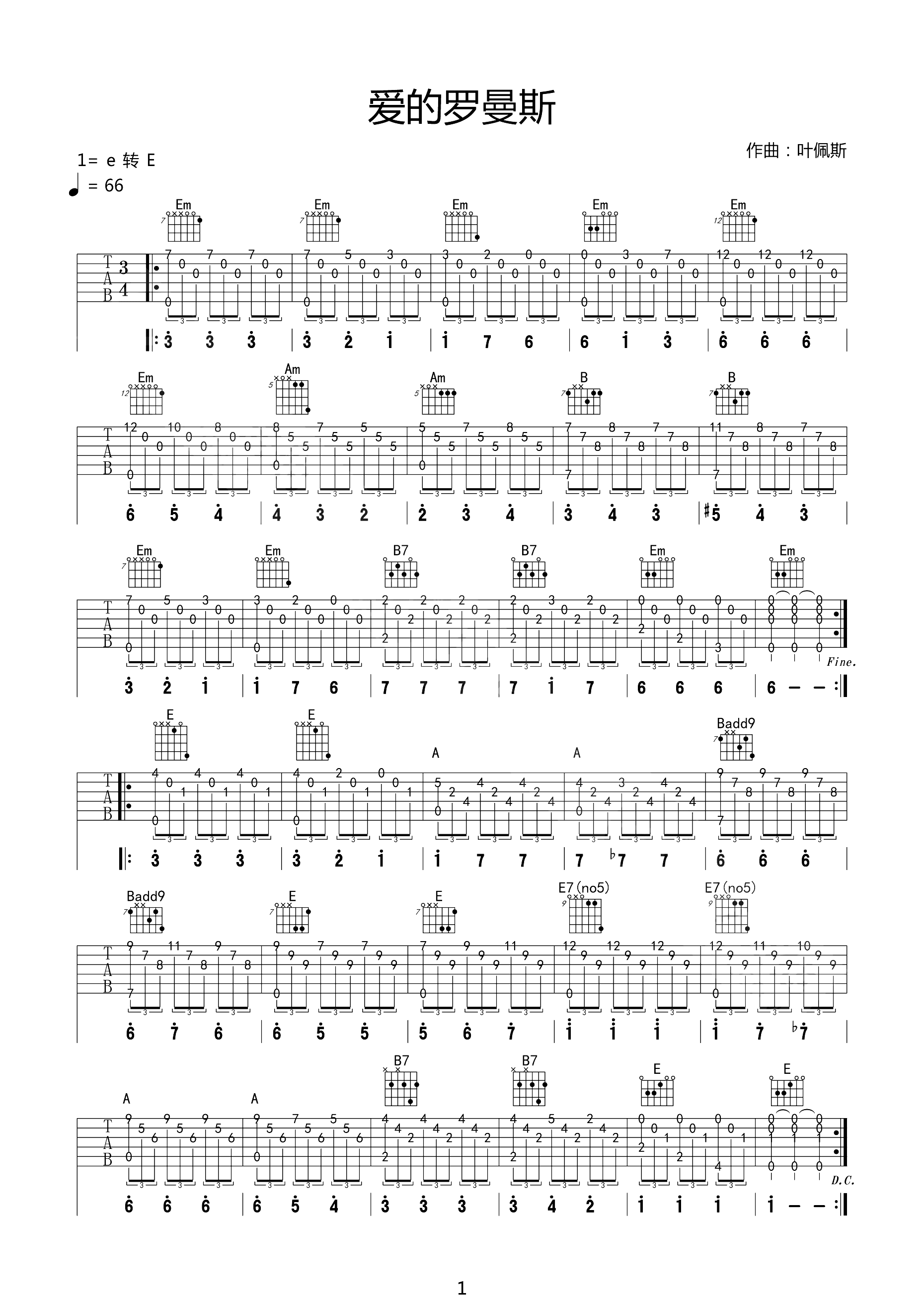 曲谱介绍: 《爱的罗曼史》这首乐曲,主旋律取材于西班牙传统民谣。1952年,法国影片《被禁止的游戏》的导演,邀请西班牙著名吉他演奏家叶佩斯,为这部影片配乐。该影片的主题音乐就是这首《爱的罗曼史》,《被禁止的游戏》上映以后,《爱的罗曼史》广为流传,并成为所有知名吉他演奏家的保留曲目;乐曲优美纯朴的旋律与清澈的分解和弦完全溶为一体,充满温柔,是吉他曲中的一首不朽名作。 这首曲子的含义:是叶佩斯为了表达电影主题而改的西班牙民谣 所以名字叫romance 此曲也是吉他学习者的必须学的一首曲子。 《爱的罗曼史》家喻户晓,几乎是吉他曲的代名词。 Lama亦一直以此曲作为“爱”的象征,还准备纳入“情人节”专题,直到昨晚看了电影《禁忌的游戏》。 《禁忌的游戏》说的是战争、死亡和孤儿,基调相当灰暗,贯穿影片的这曲主题音乐,只是表现两个苦难孩子间可怜兮兮的温情。 《禁忌的游戏》毫不犹豫地颠覆了Lama对此曲的理解。不好意思,Lama再听此曲,虽优美依旧,然浪漫不再,忧伤已挥之不去……  吉他版《爱的罗曼史》,这首经典名曲陪伴了无数人,至今还是很多人的共同回忆,每次听到这首曲子,总会想到很多画面,童话世界里的银河,圣诞的雪夜,夕阳下的枫叶林……这一切美好的景象,希望你的梦里也有仙境,晚安。