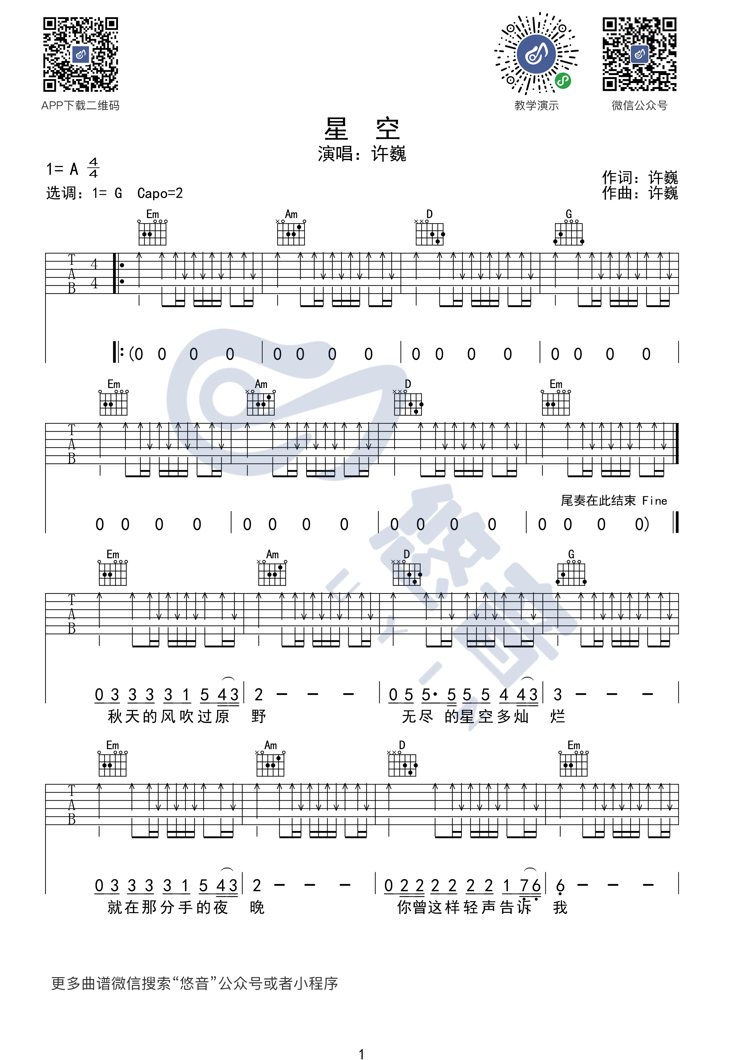 星空吉他谱 - 许巍 - A调吉他弹唱谱