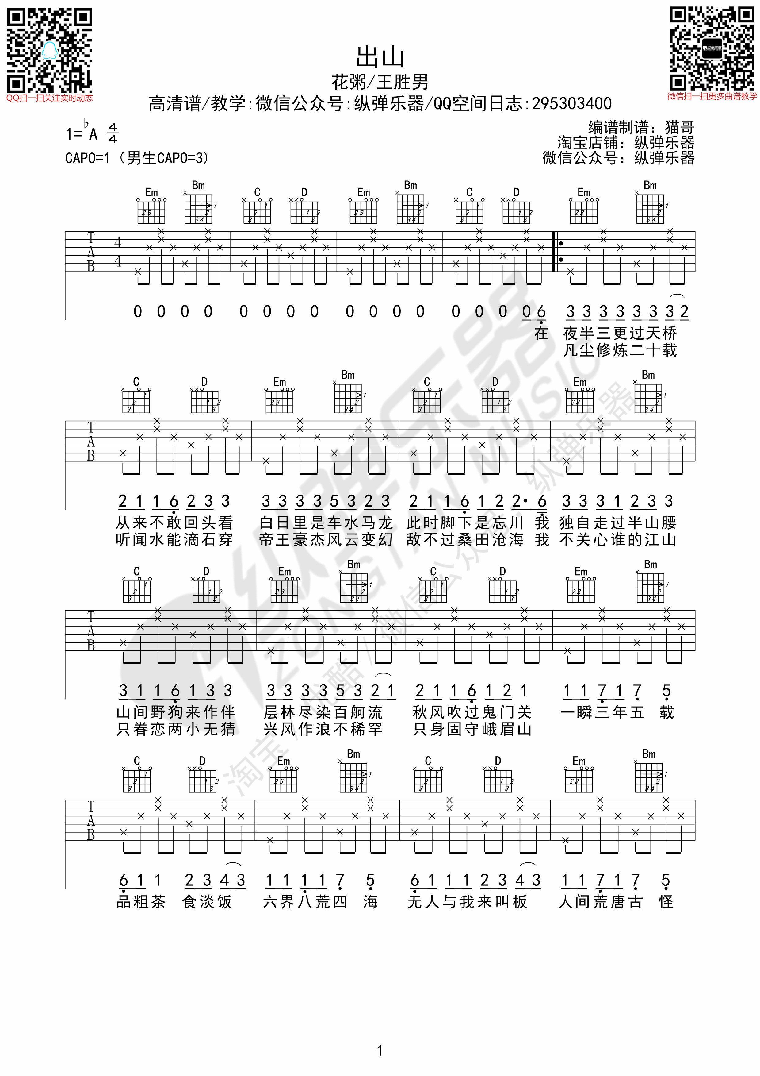 出山吉他谱 - 花粥 - 吉他独奏谱