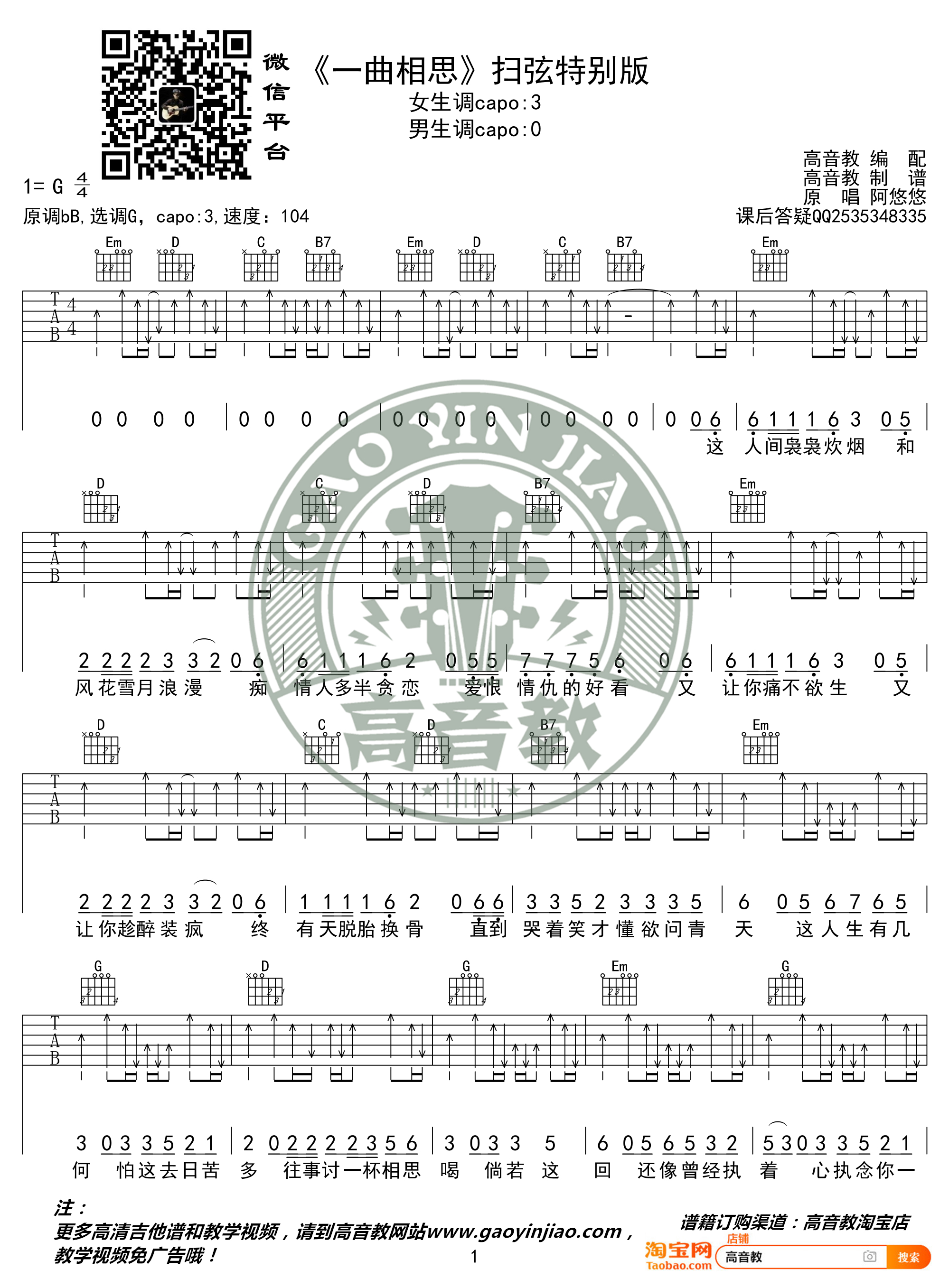一曲相思吉他谱 - G调吉他弹唱谱