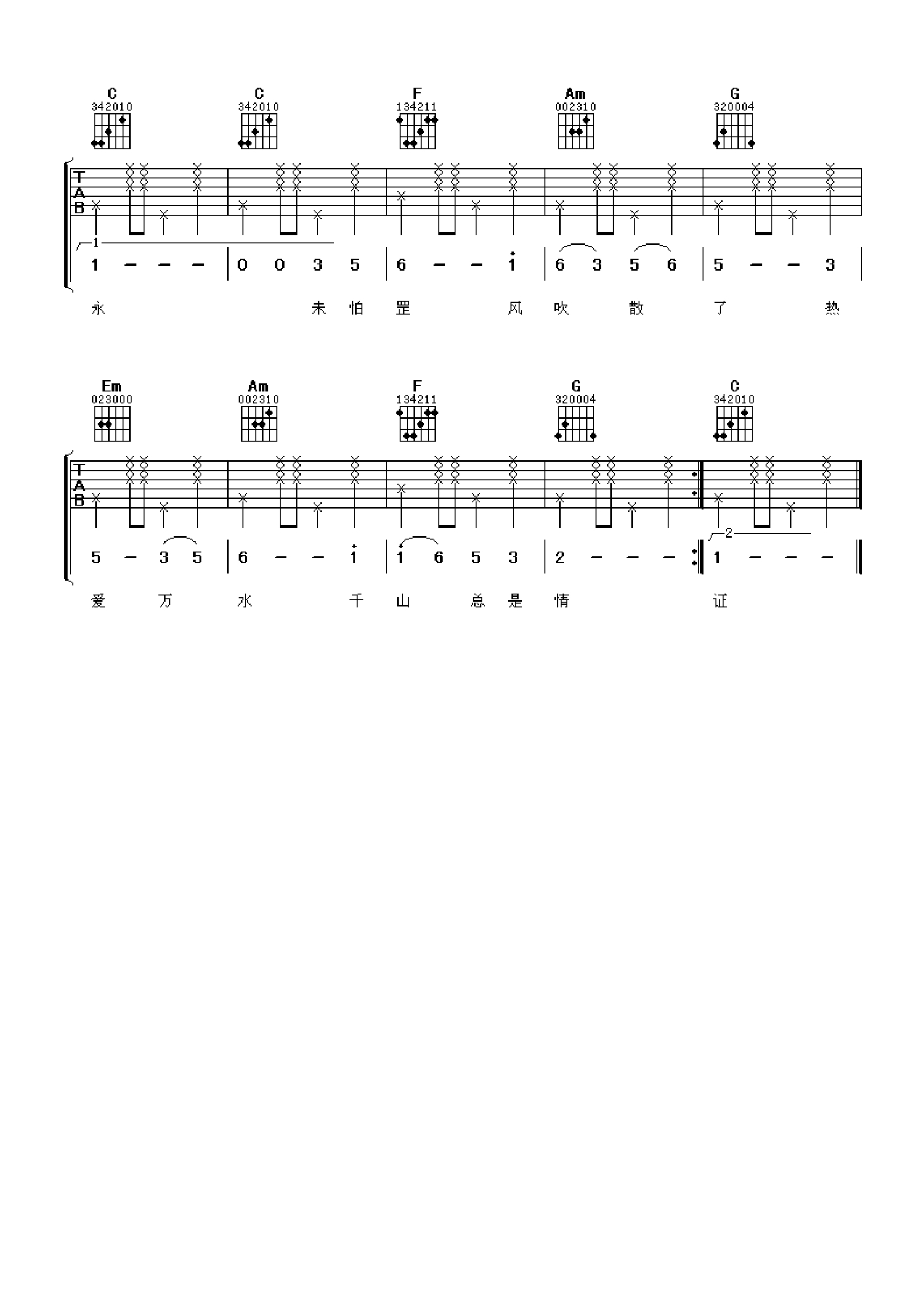 曲谱介绍: 万水千山总是情吉他谱-汪明荃吉他歌曲六线谱早期香港电视连续剧在大陆热播时,那些优美的主题曲也得以传唱,并且一直流行到现在,比如这首《万水千山总是情》,也许剧情早已忘记,但电视剧的主题歌却经过时光的流逝,依然在记忆深处感动我们。听着汪明荃这首抒情优美的歌曲,回忆当年用发音并不标准的粤语哼唱出《万水千山总是情》,温暖总是在心里涌动。选调C调,您可以根据和弦示意图和扫弦节奏型进行吉他弹唱。