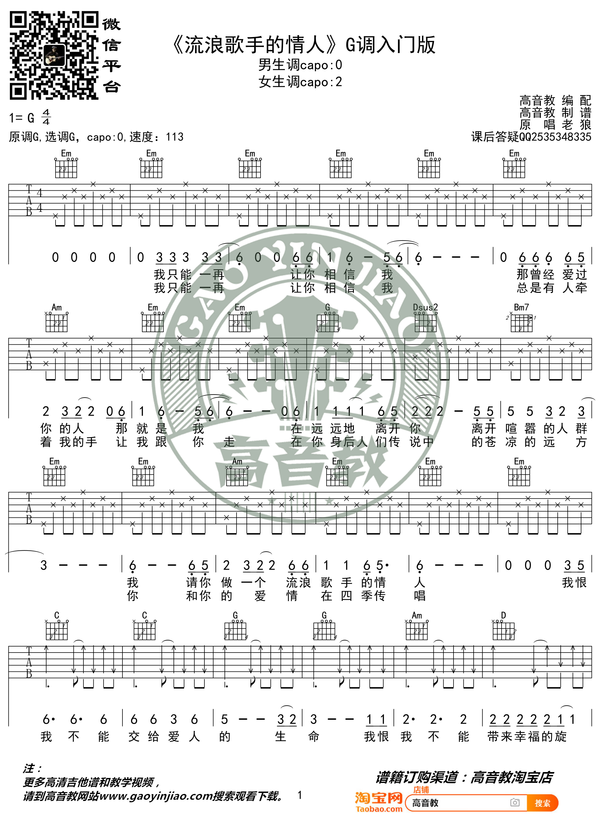 流浪歌手的情人吉他谱 - 老狼 - G调吉他弹唱谱