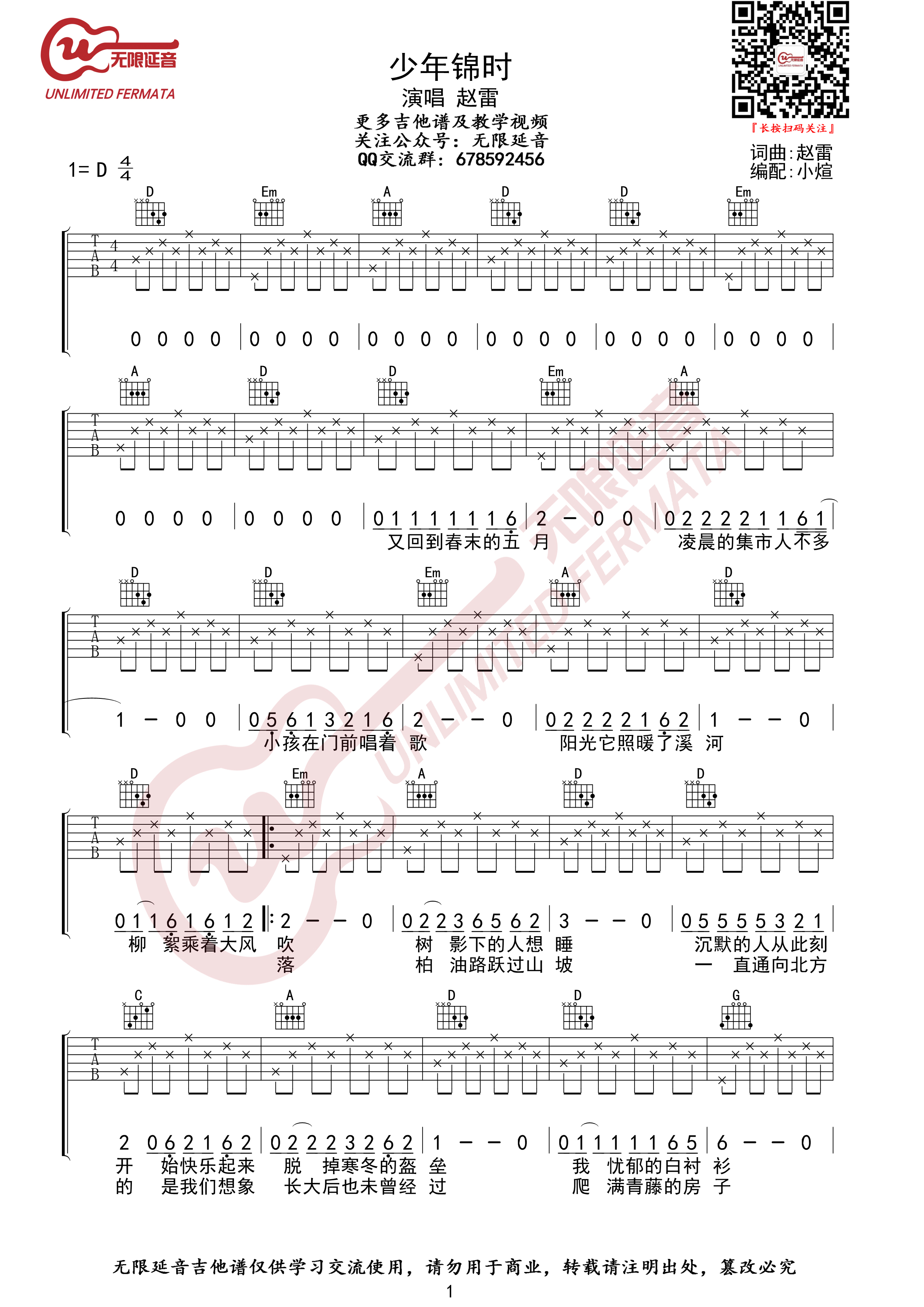 少年锦时吉他谱 - 怀念旧时光赵雷 - D调吉他独奏谱