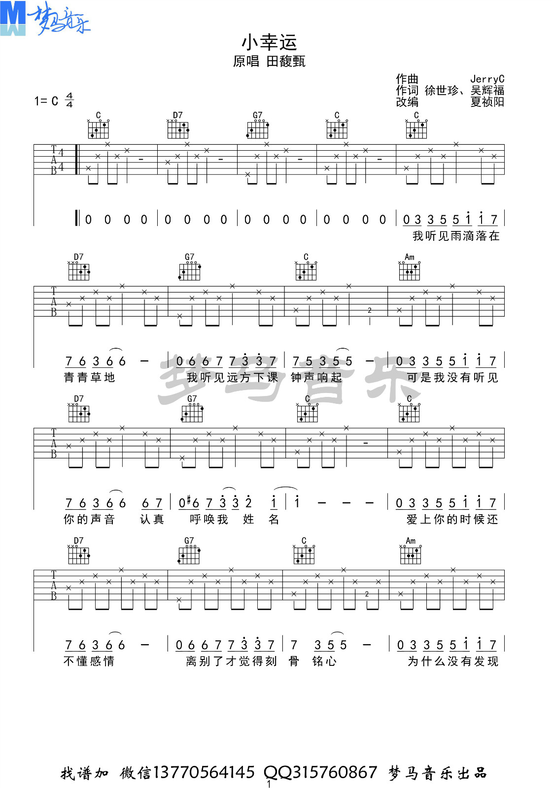 曲谱介绍: 《小幸运》是田馥甄演唱的一首歌曲,由徐世珍、吴辉福作词,JerryC作曲,电影《我的少女时代》的主题曲。 2016年1月1日,“田馥甄‘如果IF’巡回演唱会——高雄站”的华研国际官方版MV在网络上线 《小幸运》是田馥甄继《LOVE!》之后第二次与电影合作音乐。由JerryC谱曲,徐世珍及吴辉福共同填词,这首歌曲是根据电影《我的少女时代》创作的,Jerry C在谱曲前翻阅了两遍这个电影的剧本,才谱出了与电影相得益彰的曲子。